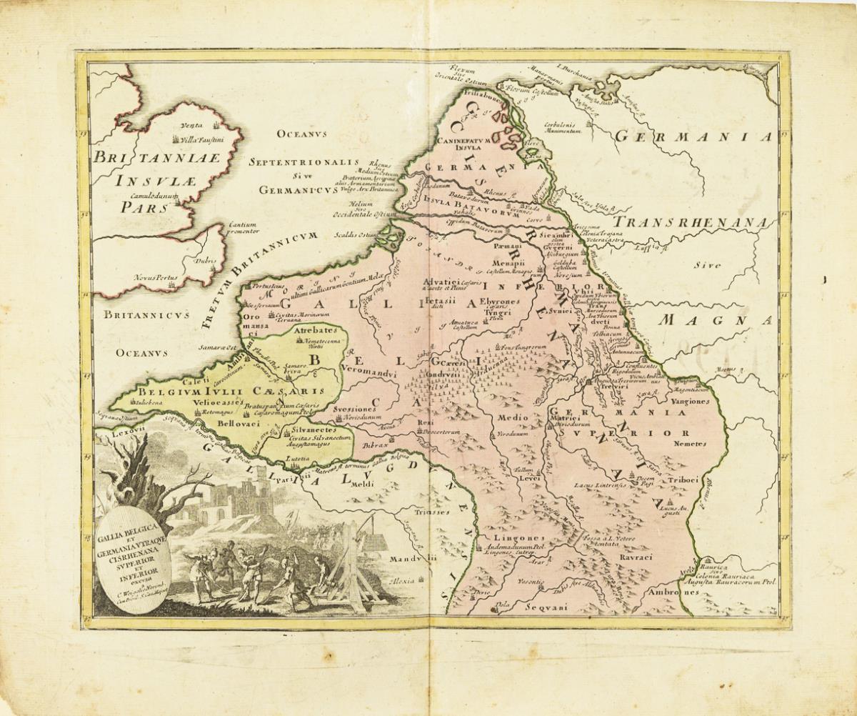 2 detailreiche historische Karten der Gebiete "Gallia Belgica" und "Gallia Transalpina", je mit dekorativen Titelkartuschen, verso mit Vermerk in Tusche "Gera d. 6. April Robert Lanzendorf" und "1799". Je mit Bugfalte, je stockfleckig und verschmutzt.