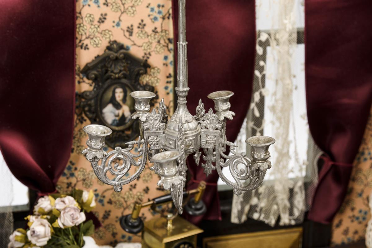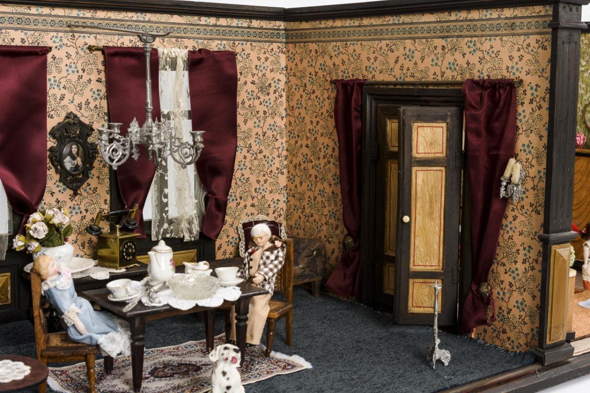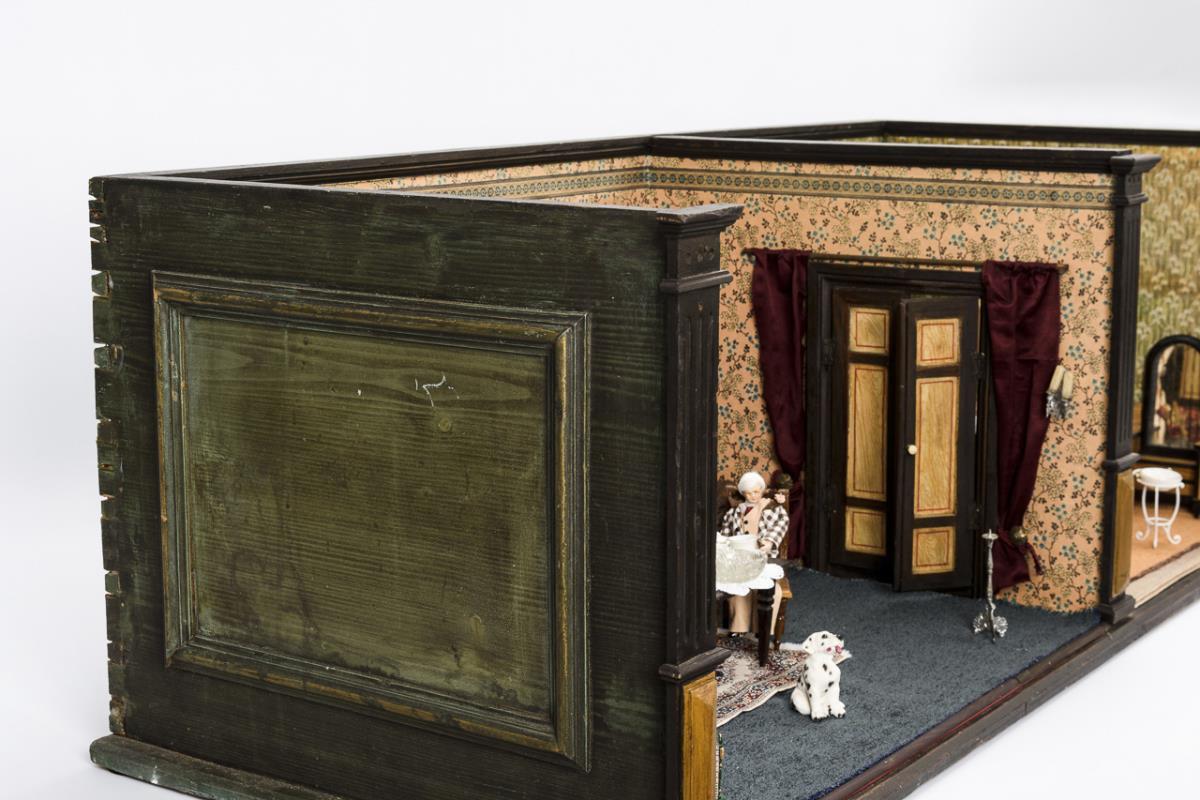 Gründerzeitliches Gehäuse mit kassettierten Seiten, kannelierten Frontlisenen, 3 unverglasten Fenstern und einer Doppelflügeltür. Wohnstube mit Eichenmöbeln und Kronleuchter aus Zinn. Schlafzimmer mit jüngeren Holzmöbeln im Art-déco-Stil, darunter Doppelbett, Waschtisch und Frisierkommode. Dazu 4 Puppenstubenpuppen. Bespielt, Altersspuren, Bodenbeläge jünger ergänzt.