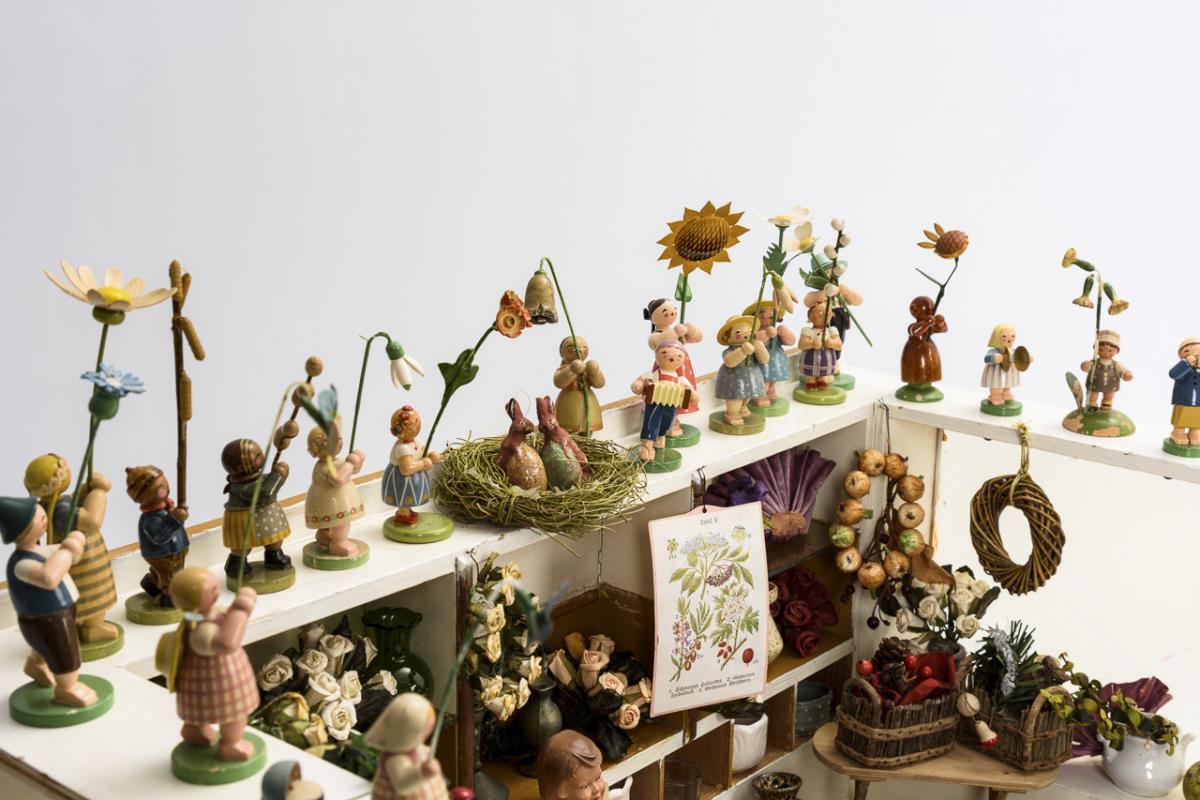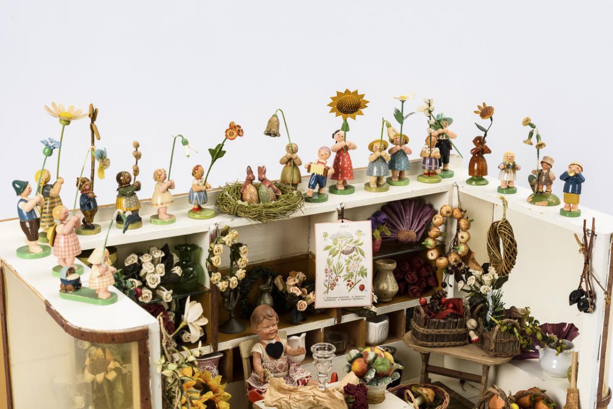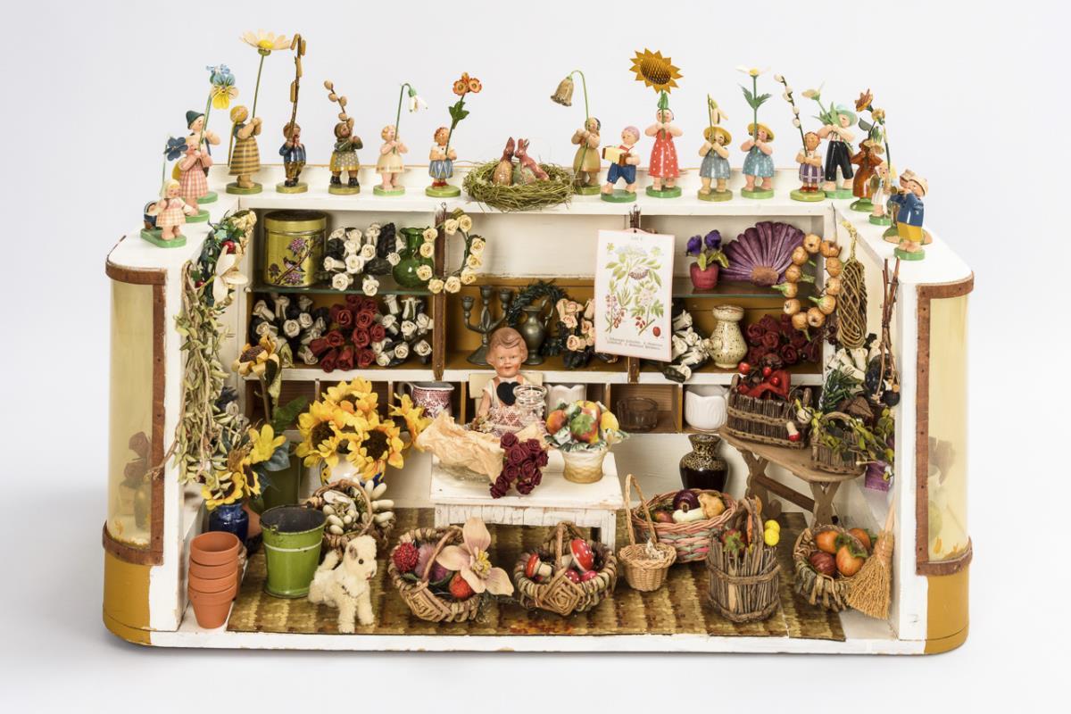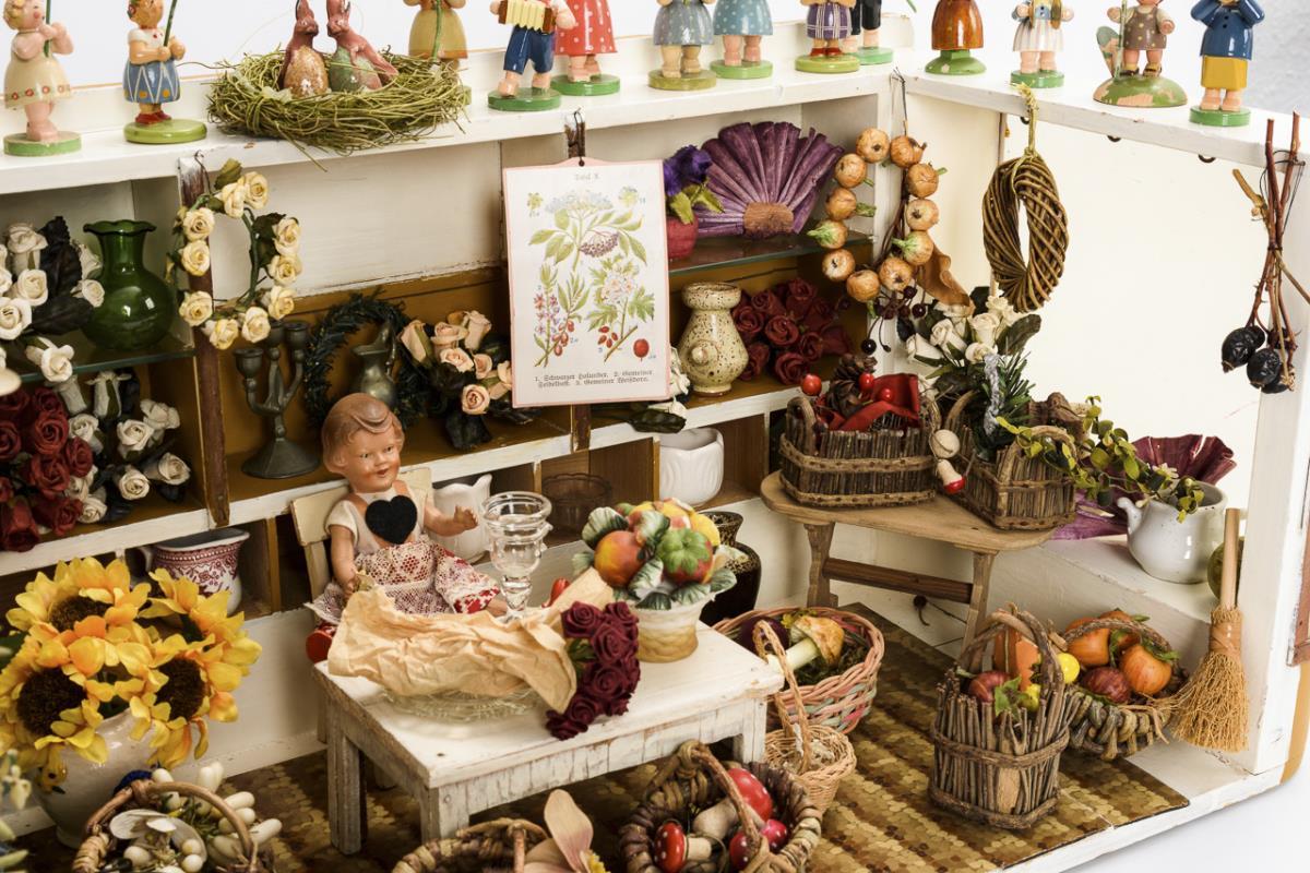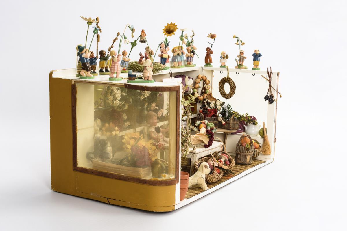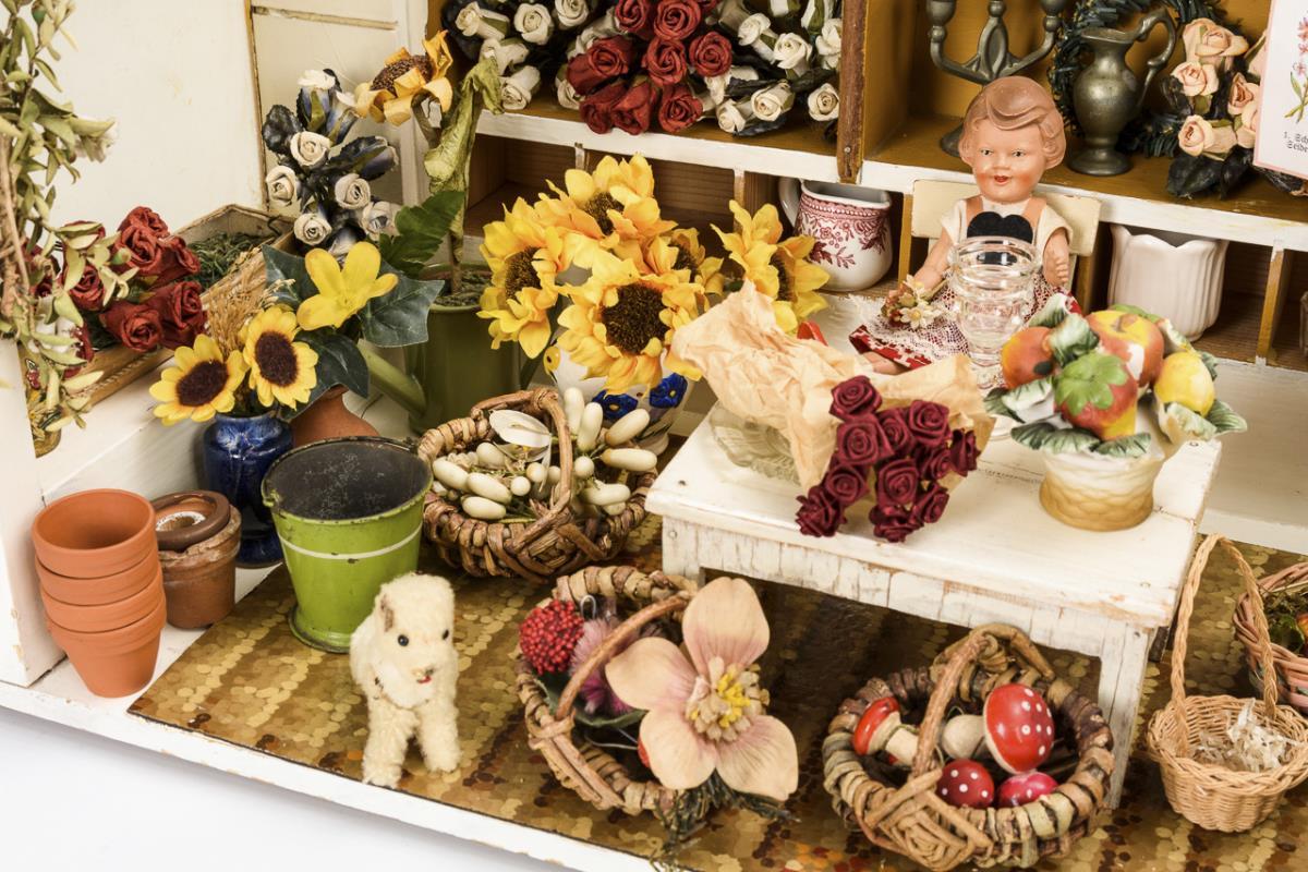 Umdekorierter Kaufladen mit 2 großen, seitlichen Schaufenstern aus Kunststoff und rückseitigem Regaleinbau. Ausgestattet mit verschiedenen Kunstblumen und -Früchten sowie Blumenkindern von Wendt & Kühn. Dazu Celluloid-Puppe als Verkäuferin mit Hund. Bespielt, Altersspuren, kleine Defekte.