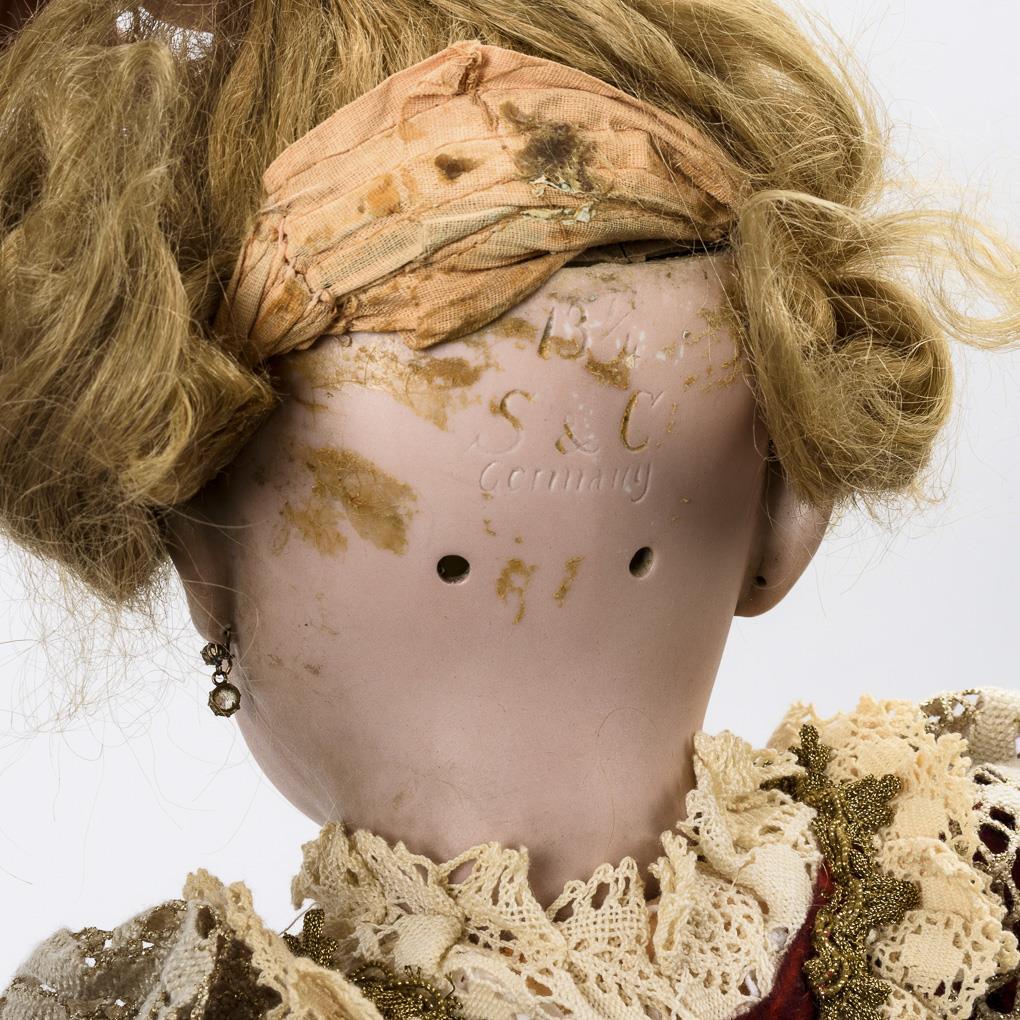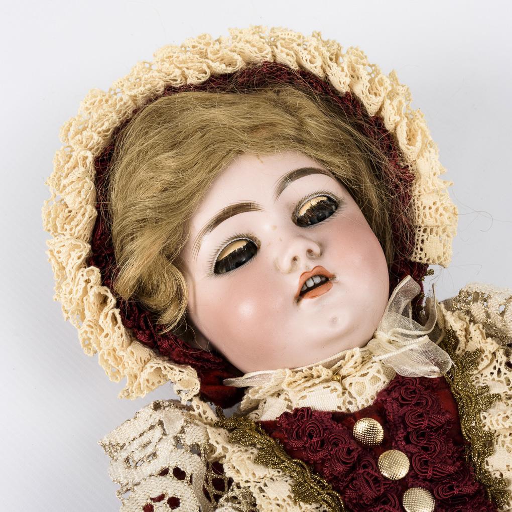Kurbelkopf, blaue Schlafaugen, Wimpernreste, Ohrringe, blonde Echthaarperücke. 15-teiliger Gliederkörper mit rotem Stempel "Germany 6". Weinrotes Kleid, passende Haube, schwarze Samtschuhe. Kopf durchleuchtet: ohne Defekte, lediglich etwas Perückenpull an der Kopfkrone. Zehenspitzen rechts minimal bestoßen.