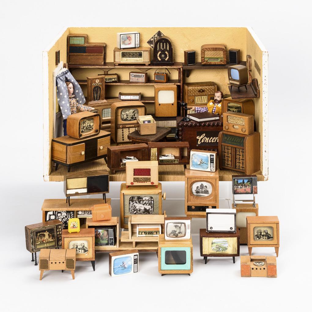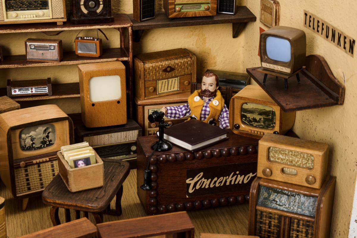 Eigenbau. Einfaches 1-Raum-Gehäuse mit seitlicher Tür. Eingerichtet als Radio- und Fernseh-Geschäft mit zahlreichen Objekten aus unterschiedlichen Jahrzehnten. Dazu 2 Puppenstubenpuppen. Bespielt.