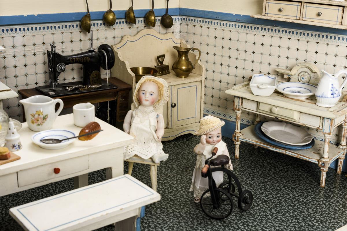 Trapezförmiges Gehäuse mit halbhohem Fliesenspiegel und Linoleumboden. Eingerichtet mit weißen Küchenmöbeln, Blechherd, Singer-Nähmaschine, 3 Wandregalen etc. Zubehör aus Metall, Porzellan und Holz. Dazu 4 Püppchen und "Nürnberger Puppen-Kochbuch". Fliesenfries und Bodenbelag jünger ergänzt, Altersspuren und kleine Defekte.