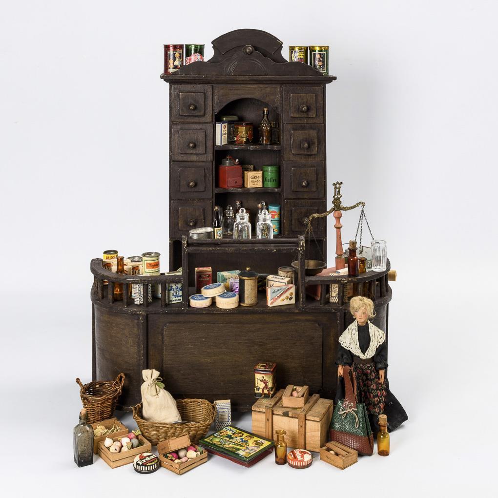 Im alten Stil gestaltetes Regal mit 8 Schüben und 4 offenen Fächern. Dazu leicht gerundete Theke mit kleinem Balustraden-Aufsatz. Ausgestattet mit umfangreichem, meist altem Zubehör, darunter Waage, Kaffeemühle, Körbe, Dosen, Gemüsekisten etc. sowie jüngere Puppe als Verkäuferin. Bespielt, teils kleine Defekte oder Altersspuren.