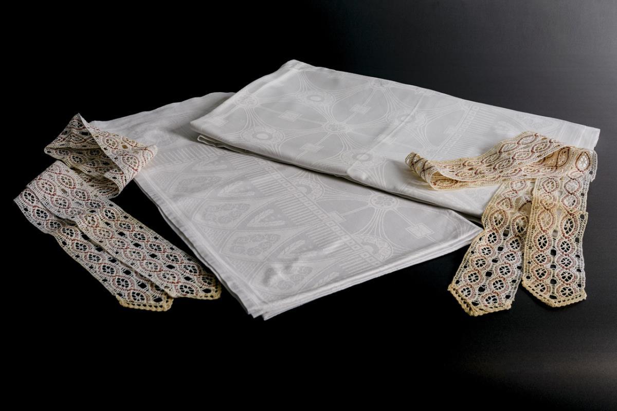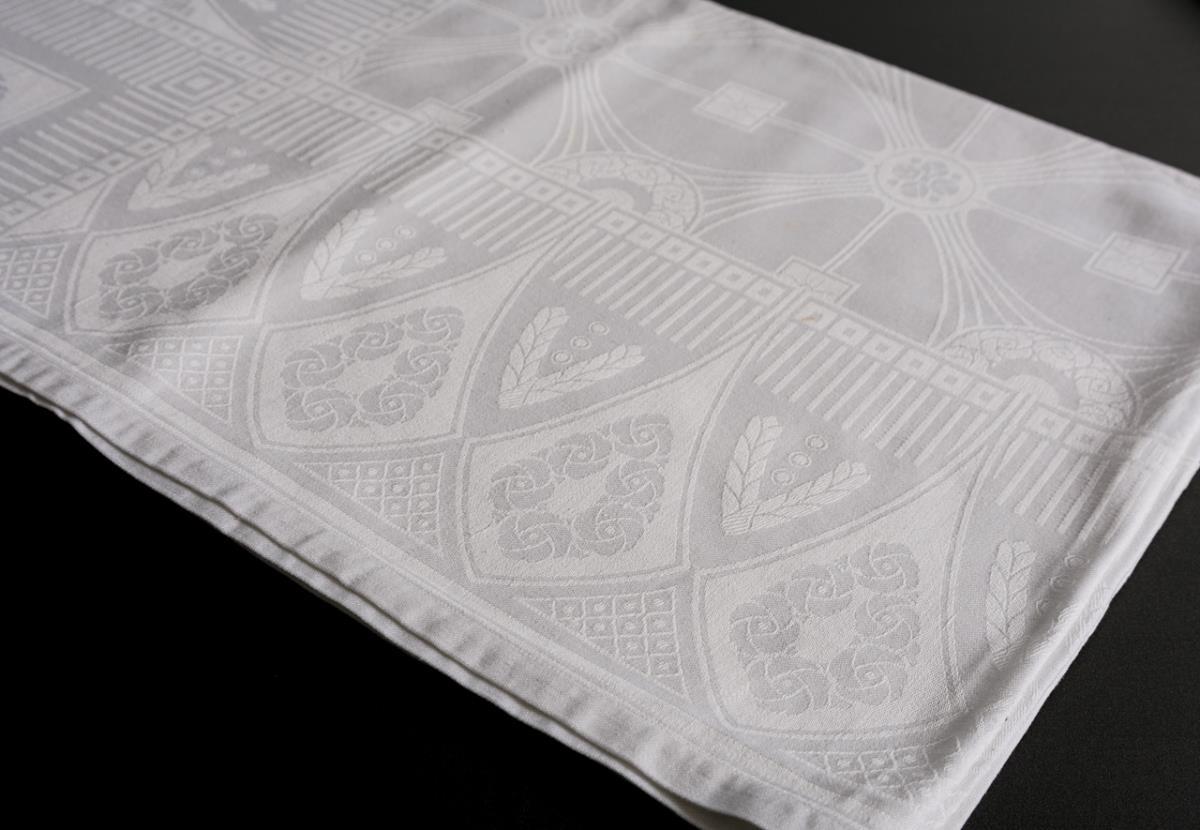 Großes Tafeltuch und Tischtuch mit Jugendstil-Ornamenten. 1 gestopftes kleines Loch. 2 gehäkelte Tischbänder.