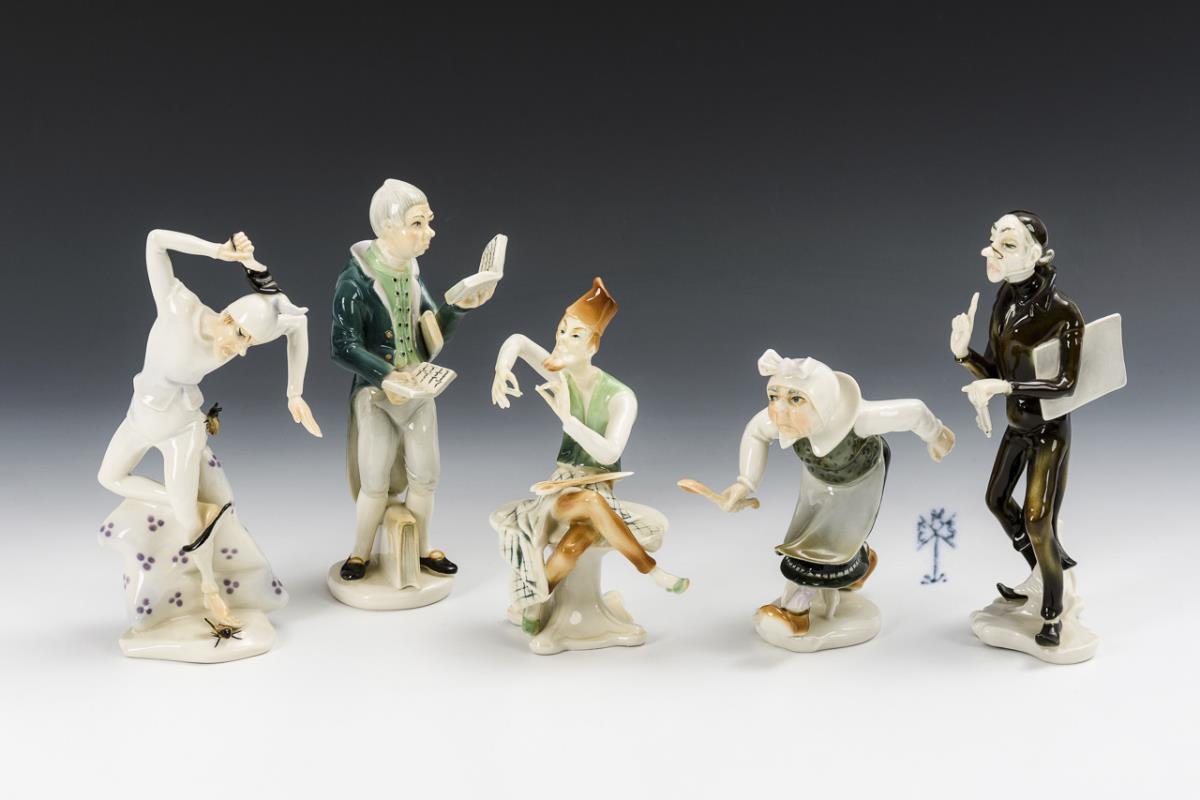 4 Figuren nach "Max und Moritz" von Wilhelm Busch (Witwe Bolte, Schneider Böck, Lehrer Hämpel, Onkel Fritz). / 1 Figur "Der Bücherwurm" nach dem Gemälde von Carl Spitzweg.
