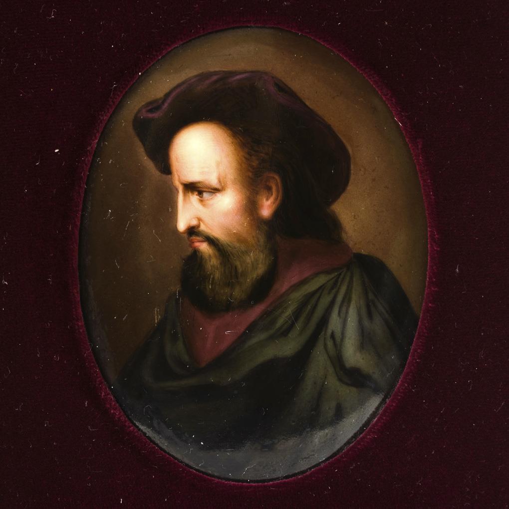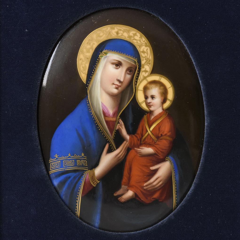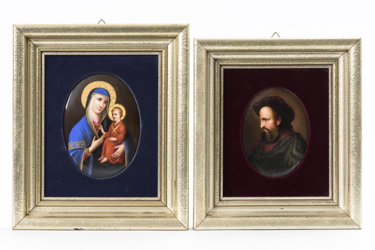 1x Porzellangemälde, ungemarkt: ovale Bildplatte mit der Darstellung der Madonna mit Kind (L 15 cm). / 1x Porzellanbild: Porträt eines Herren mit Hut (L 12,5 cm). Beide im silberfarbenen Rahmen (27,5 x 23 cm und 25,5 x 22,5 cm). Verso am Bild der Ikone kleine Randchips.