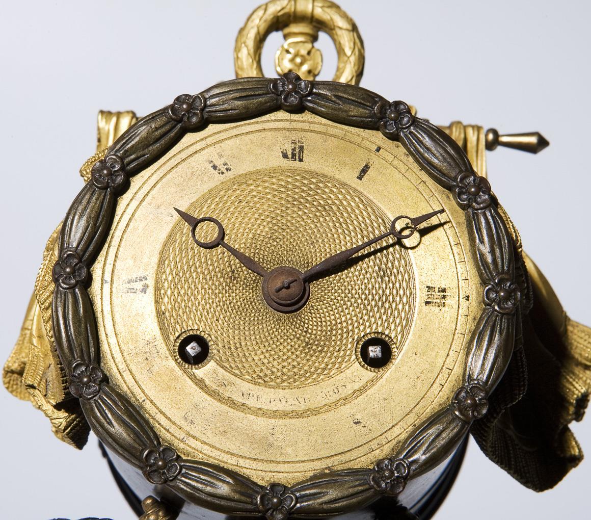 Sockel mit Ornamentleiste und Frontapplikation auf vier verstellbaren Füßen. Vollplastisch gearbeiteter römischer Krieger vor kannelierter Vollsäule mit Trophäen. Bekrönung mit Draperie und Lorbeerkranz. Mittig guillochiertes Zifferblatt, Pendel an Fadenaufhängung, Schlagwerk auf Glocke, Schlüsselaufzug. Zahlen und Signatur berieben, Faden zur Pendelaufhängung gerissen, Funktion konnte nicht geprüft werden.