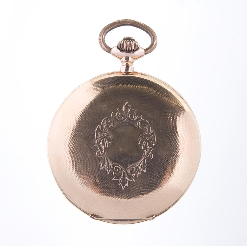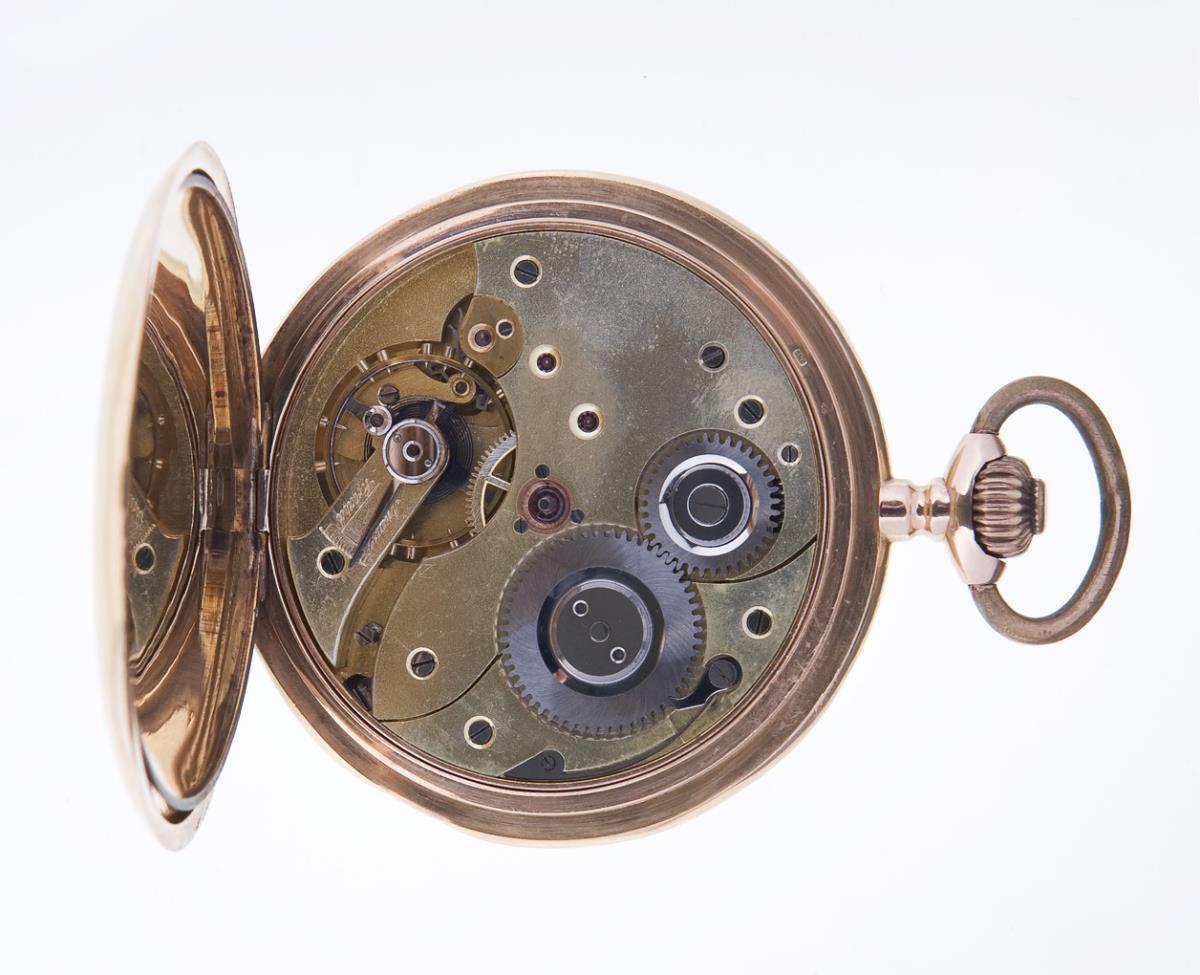 System Glashütte. Gold-Gehäuse, Metall-Innendeckel. Vergoldetes Dreiviertel-Platinen-Ankerwerk, Breguet-Spirale, 16 Rubis, verschraubter Chaton, Balancier Compensé. Weißes Emailzifferblatt mit Goldpunkten, schwarze arabische Zahlen, durchbrochen gearbeitete Zeiger, kleine Sekunde. Kronenaufzug. Im Kurzzeit-Test funktionsfähig. Kleine Dellen.