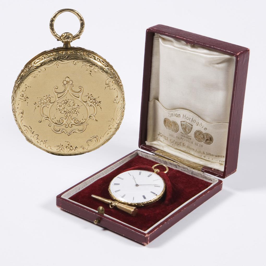Gold-Gehäuse fein graviert, Gold-Innendeckel. Vergoldetes Brücken-Zylinderwerk mit gebläuten Stahlschrauben, 4 Rubis. Weißes Emailzifferblatt, schwarze römische Zahlen, grazile Zeiger. Ohne Punzen, Feingehalt mit Säure geprüft. Original-Schlüssel. Im Kurzzeit-Test funktionsfähig. Zifferblatt seitlich an zwei Schrauben, Vergoldung am Schlüssel defekt.