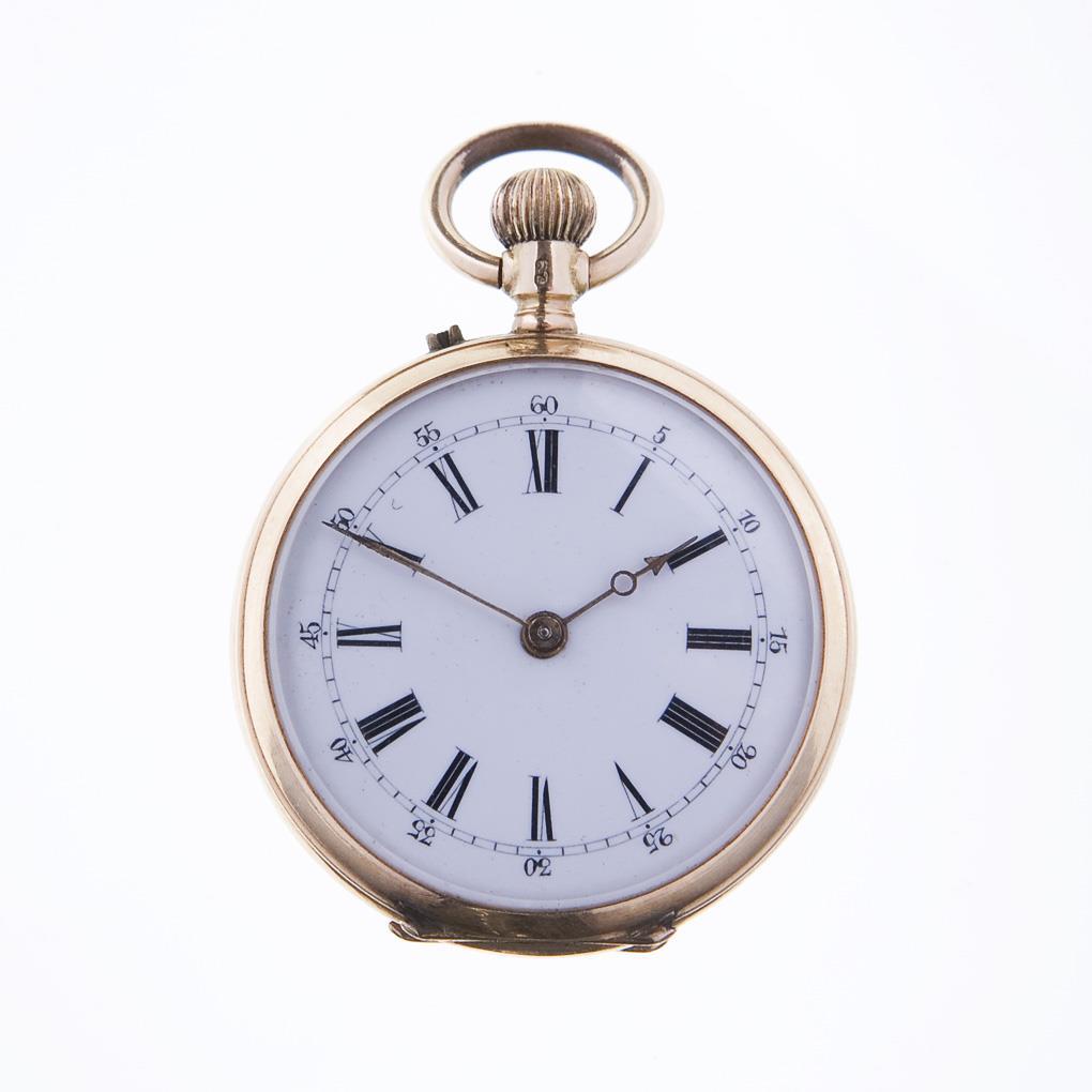 Gold-Gehäuse, Metall-Innendeckel. Zylinder-Brückenwerk mit gebläuten Stahlschrauben. Weißes Emailzifferblatt, schwarze römische und arabische Zahlen. Kronenaufzug. Kleine Dellen, Service nötig.