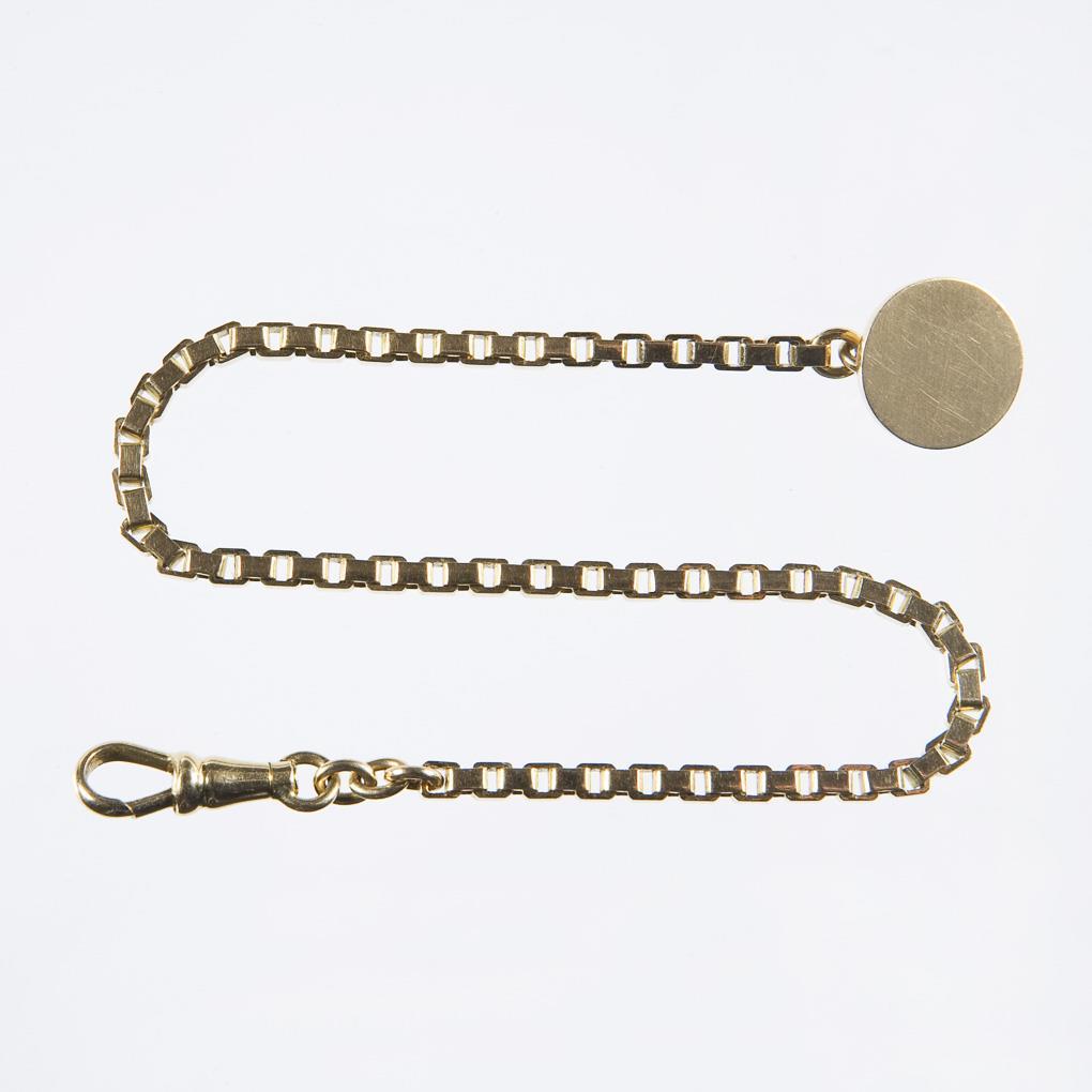 Venezianerkette mit Karabiner und Knopfanhänger. Punzen: Feingehalt, Juweliermarke.