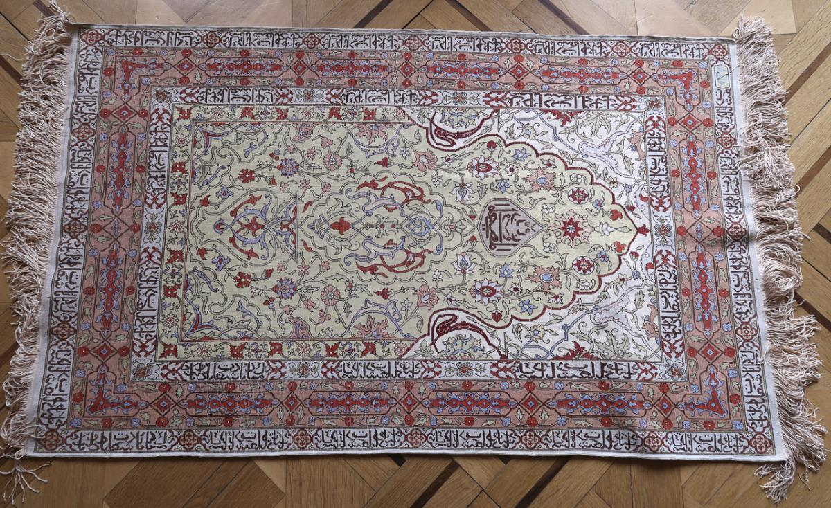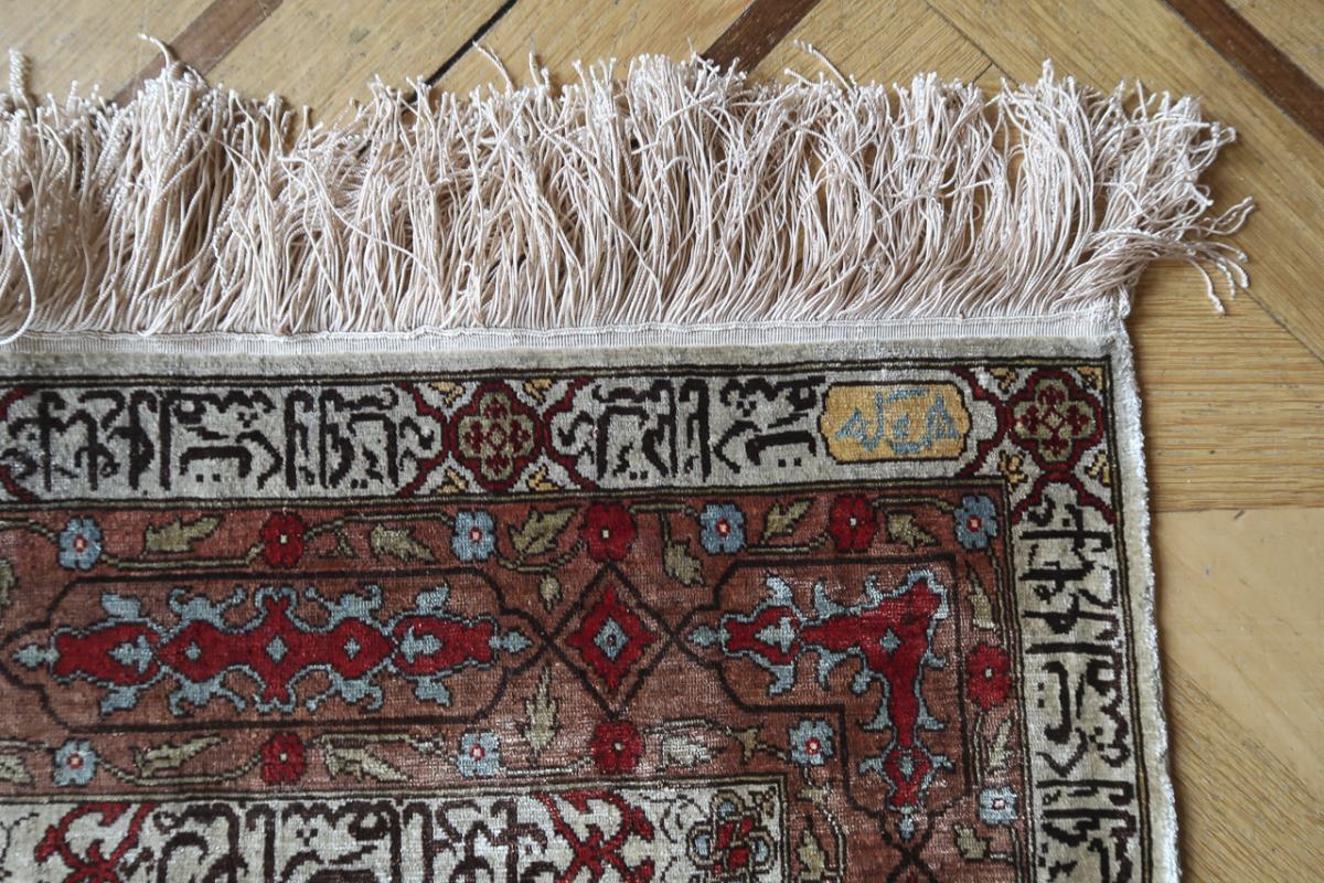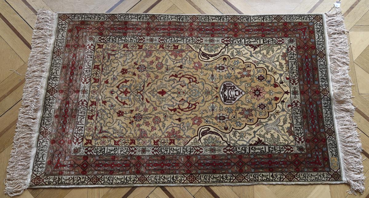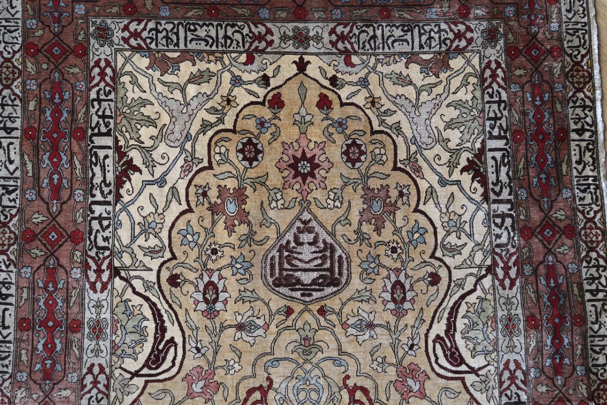 Handgeknüpfter türkischer Teppich, circa eine Million Knoten pro Quadratmeter. Ein klassischer Nischenteppich mit broschierter Kalligraphie im Giebel. Die beiden Nebenbordüren sind mit Schriftelementen gefüllt. Guter Zustand.