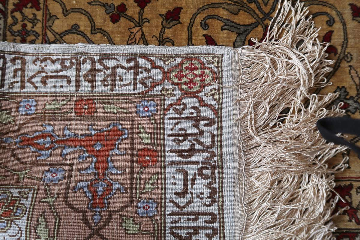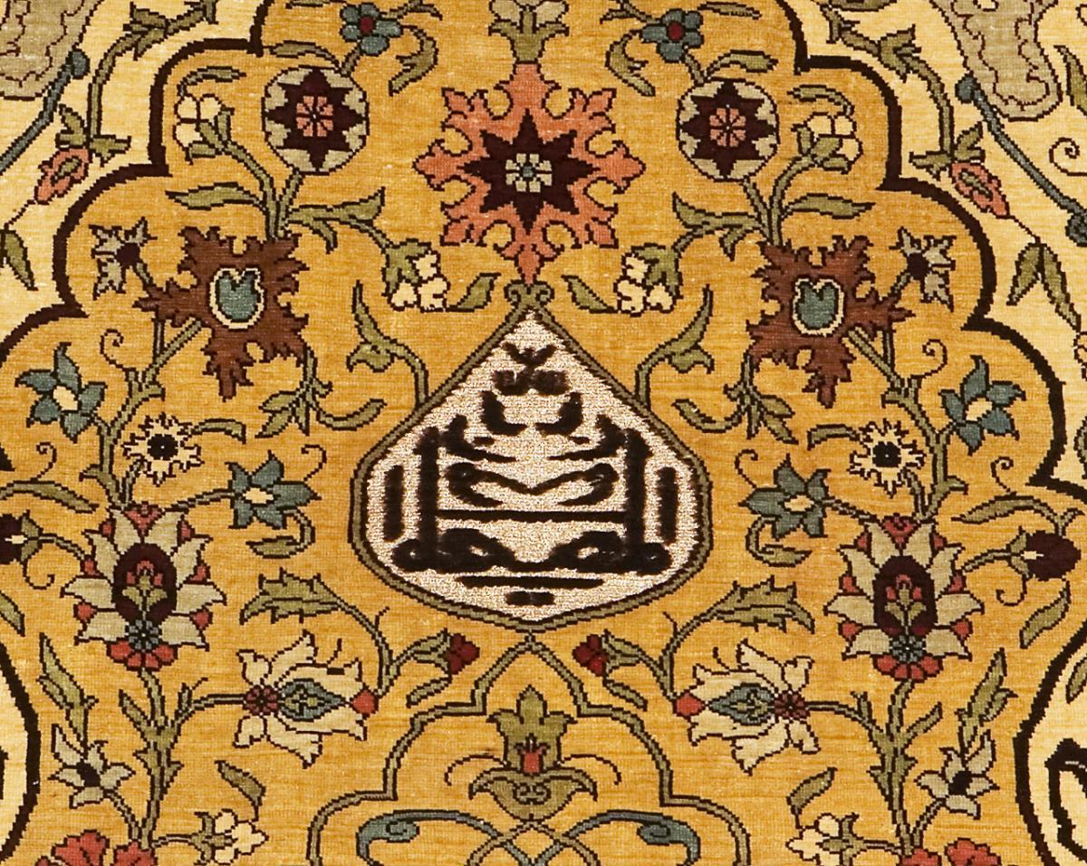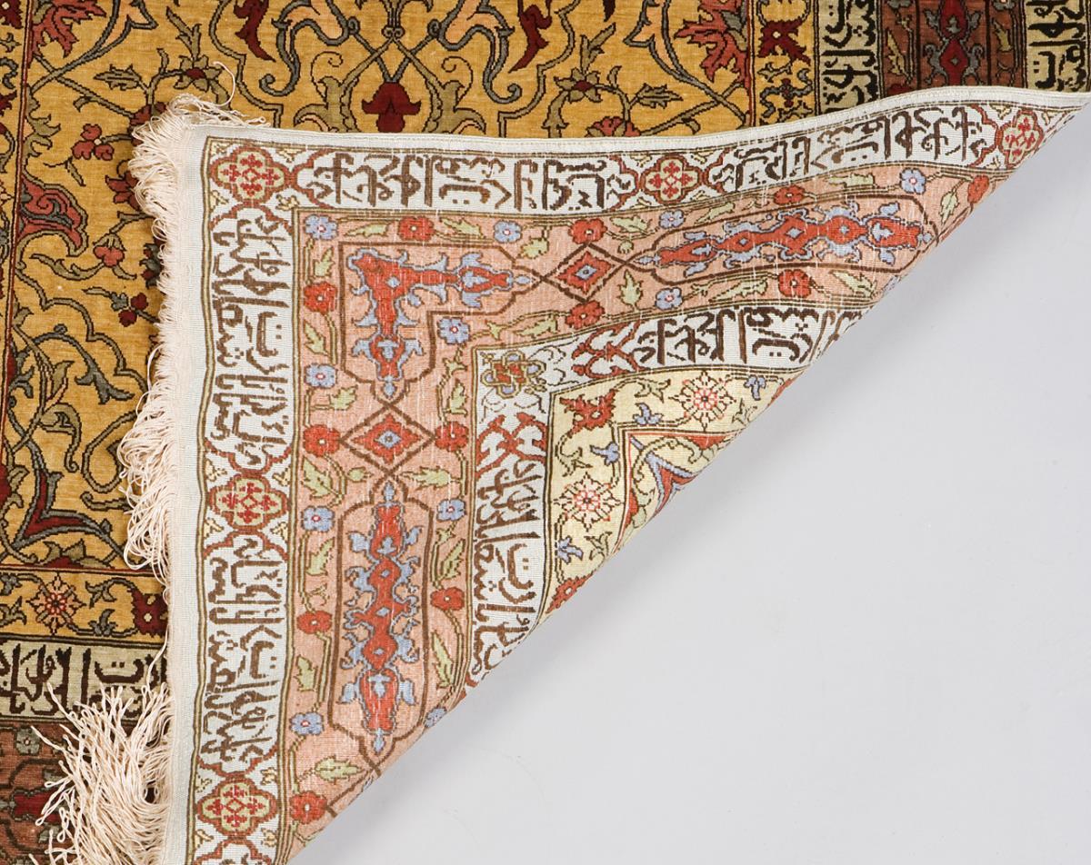 Handgeknüpfter türkischer Teppich, circa eine Million Knoten pro Quadratmeter. Ein klassischer Nischenteppich mit broschierter Kalligraphie im Giebel. Die beiden Nebenbordüren sind mit Schriftelementen gefüllt. Guter Zustand.