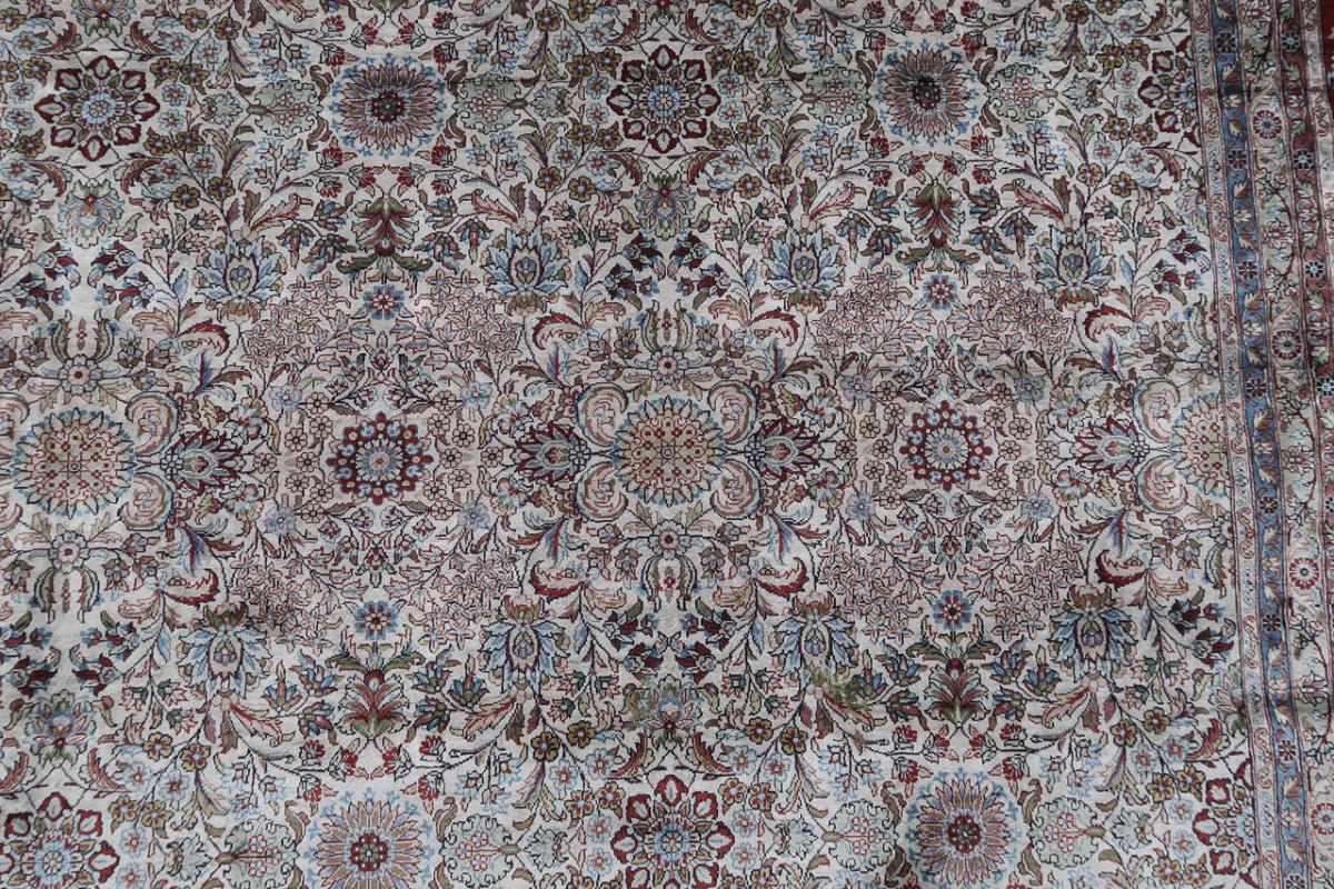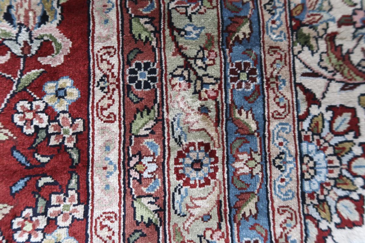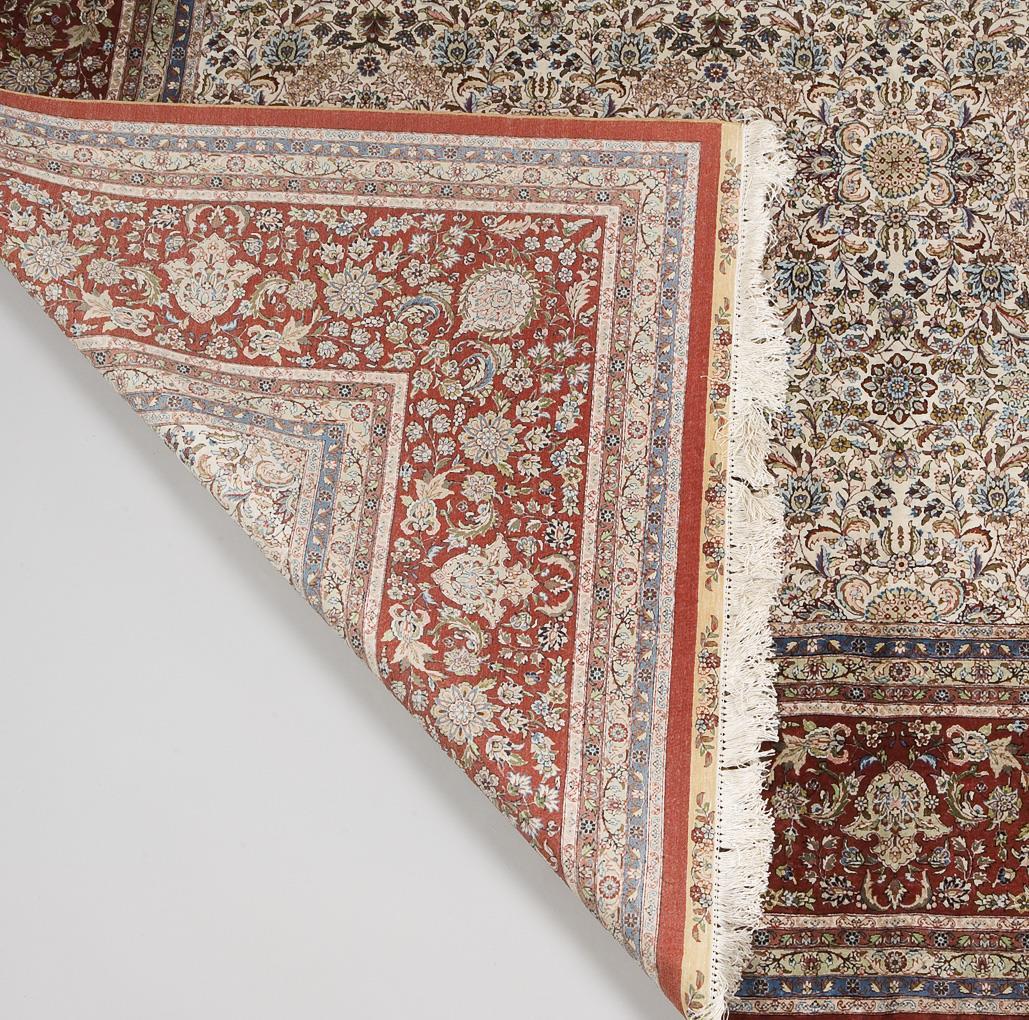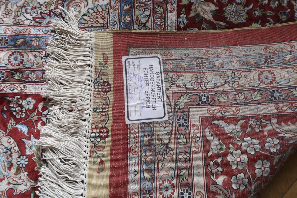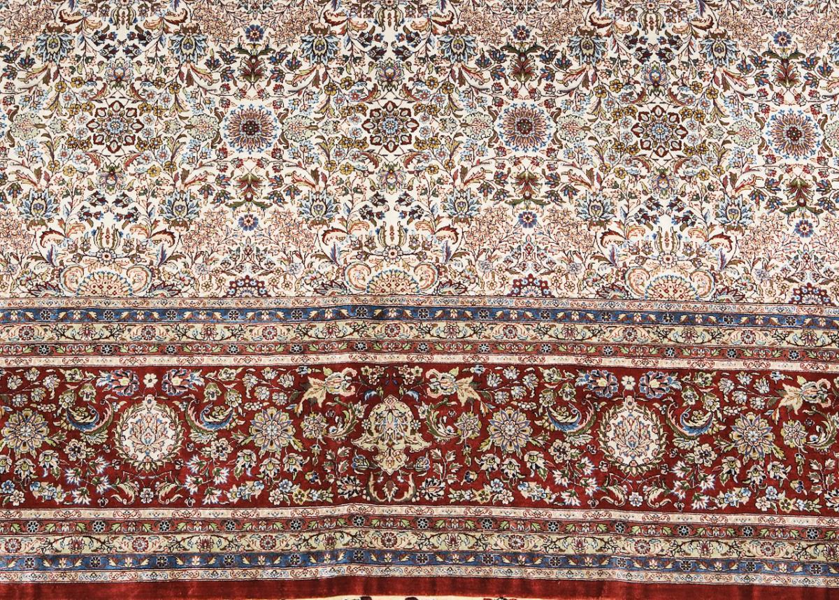 Eleganter handgeknüpfter türkischer Teppich, signiert: "Aflak-Hereke". Floral durchgemustertes hellgrundiges Innenfeld, weinrote Hauptbordüre mit für Hereke typischem Blütenmuster. In den Kelimabschlüssen sind dekorative Elemente eingeknüpft. Circa eine Million Knoten pro Quadratmeter. Sehr guter Zustand.