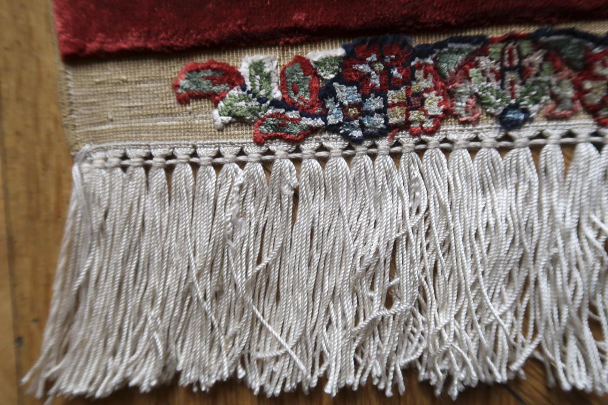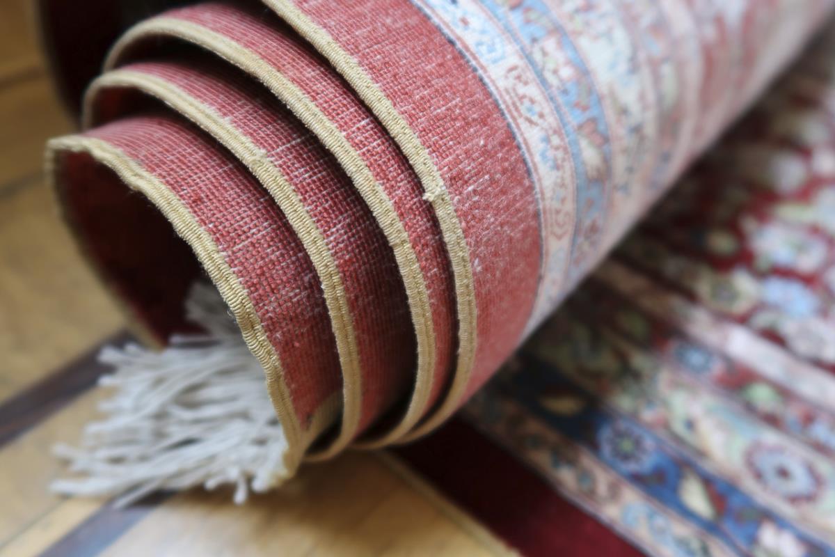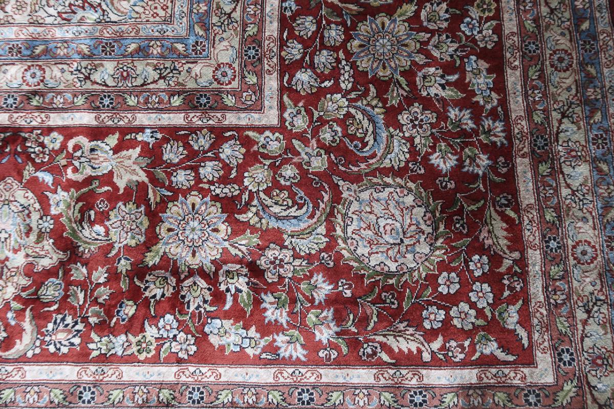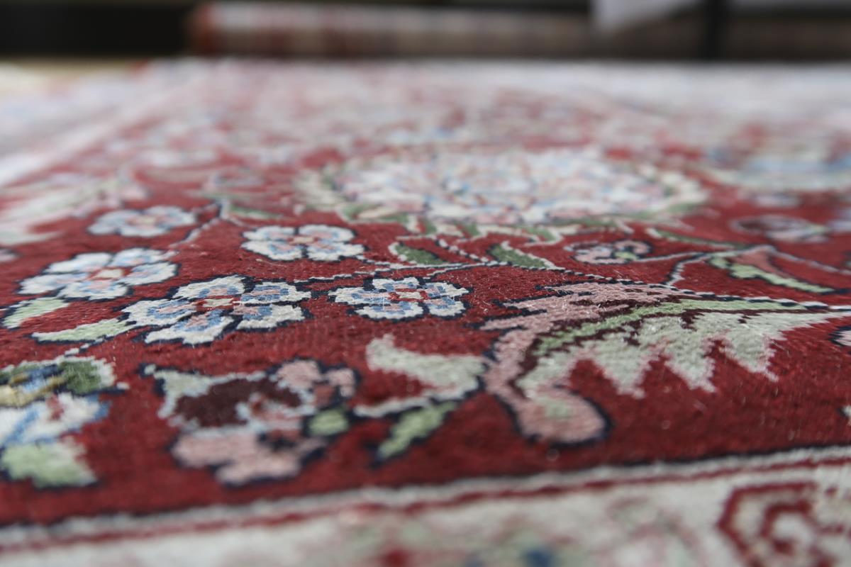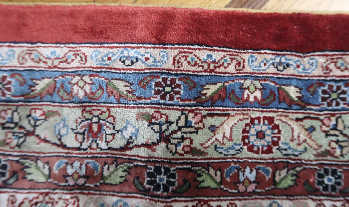 Eleganter handgeknüpfter türkischer Teppich, signiert: "Aflak-Hereke". Floral durchgemustertes hellgrundiges Innenfeld, weinrote Hauptbordüre mit für Hereke typischem Blütenmuster. In den Kelimabschlüssen sind dekorative Elemente eingeknüpft. Circa eine Million Knoten pro Quadratmeter. Sehr guter Zustand.