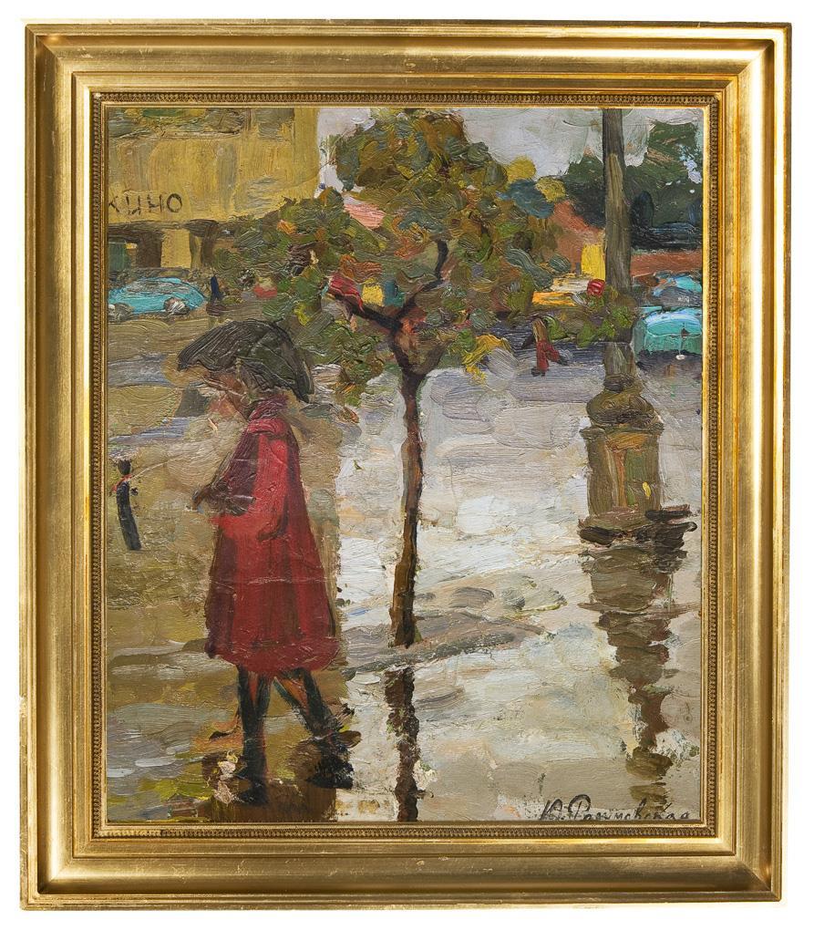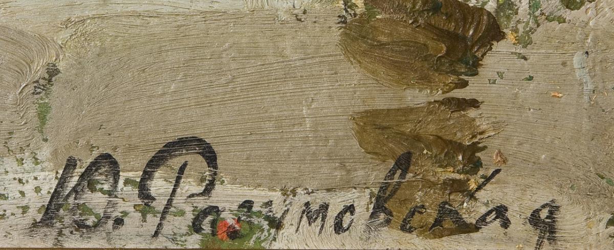 Stimmungsvolle, überlegt komponierte und gekonnt umgesetzte Genreszene in pastosem Farbauftrag. Rückseitig kyrillisch bezeichnet. Profilierter Goldrahmen.