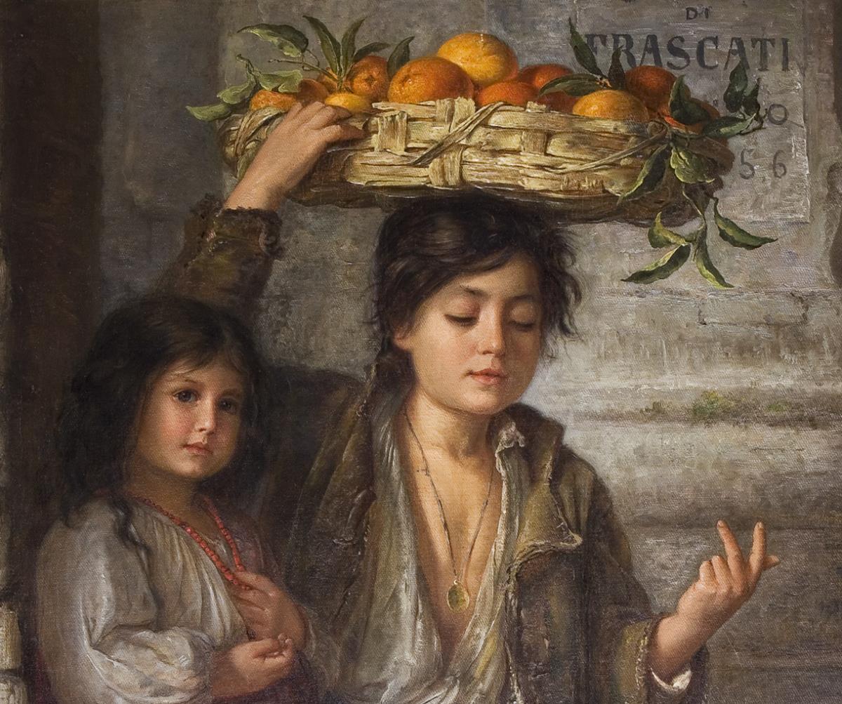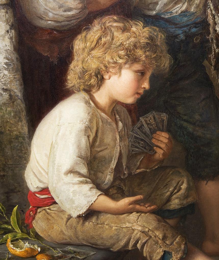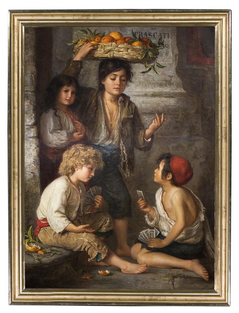 Ein attraktives, fein und überaus detailreich gemaltes Motiv aus dem italienischen Volksleben. Eine beliebte Genreszene mit visuell unterhaltendem Wert. Originaler Keilrahmen. Rückseitig Reste eines alten Klebezettels der Galerie Commeter, Hamburg. Profilierter Waschgoldrahmen. Alt doubliert.