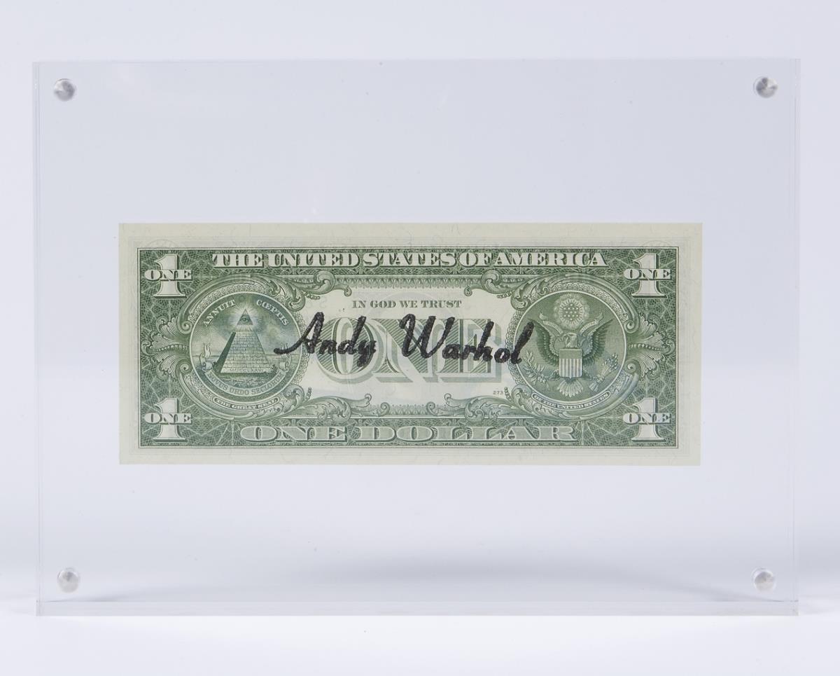 Die US Papier-Silberzertifikate im Wert von 1 Dollar wurden unter Abraham Lincoln erstmalig (1861-1865) und letzmalig 1968 ausgegeben. Sie unterscheiden sich von späteren Dollar-Noten durch den Aufdruck in der Mitte der Banknote. Sie konnten in Rohsilber umgetauscht werden. Es ist nicht bekannt, wie viele Exemplare dieser Dollarscheine von Warhol signiert wurden. Authentizität laut Zertifiakt der Galerie 32, Nizza 2019 * Partnerauktion Bergmann.