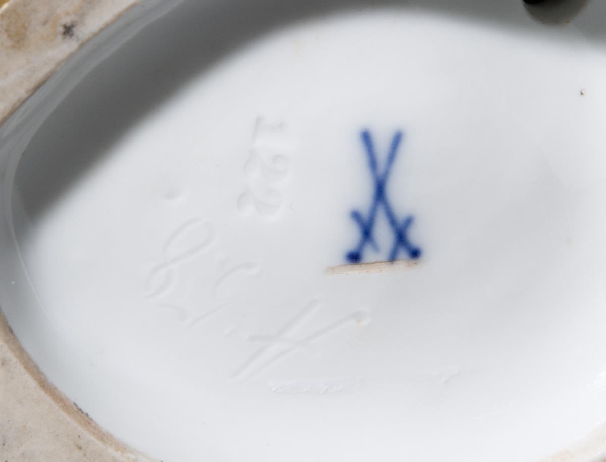 Modell von Johann Joachim Kaendler und Mitarbeiter 1764-1766. Pendant zu Modell-Nr. A 56. Farbig bemalt, gold staffiert. Ritzmarke, Pressmarke, Malermarke, Schwertermarke einmal gestrichen. Rock partiell, eine Hand, Bukett, Degen, Schuhe restauriert, Degenknauf abgebrochen, vorhanden.