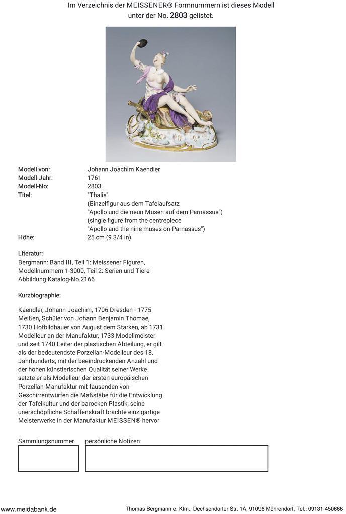 Modell von Johann Joachim Kaendler 1761. Einzelfigur aus dem Tafelaufsatz "Apollo und die neun Musen auf dem Parnassus". Farbig bemalt, gold staffiert. Unglasierter Boden, Ritzmarke, Pressmarke, Schwertermarke. Ein Unterarm, Maske, eine Hand, Federn restauriert, ein Finger bestoßen.