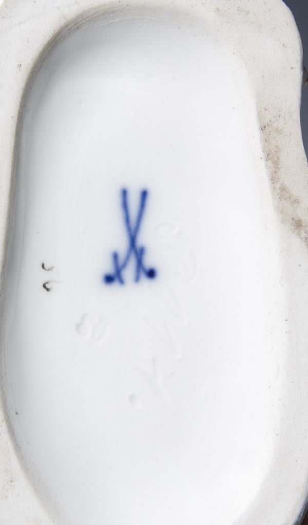 Modell von August Ringler 1893. Farbig bemalt, gold staffiert. Ritzmarke, Pressmarke, Malermarke, Schwertermarke. Werkzeuge, Holzscheite, Stamm restauriert.