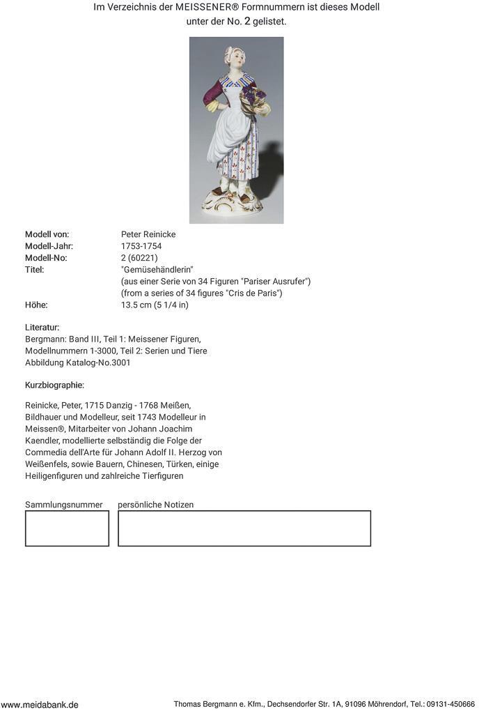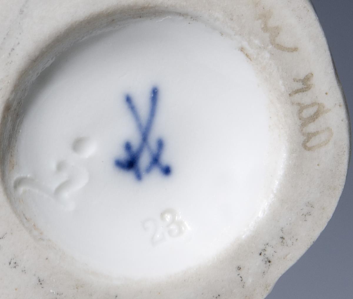 Modell von Peter Reinicke 1753-1754. Aus einer Serie von 34 Figuren. Farbig bemalt, gold staffiert. Ritzmarke, Pressmarke, Malermarke, Schwertermarke. Eine Traube, ein Blatt bestoßen.