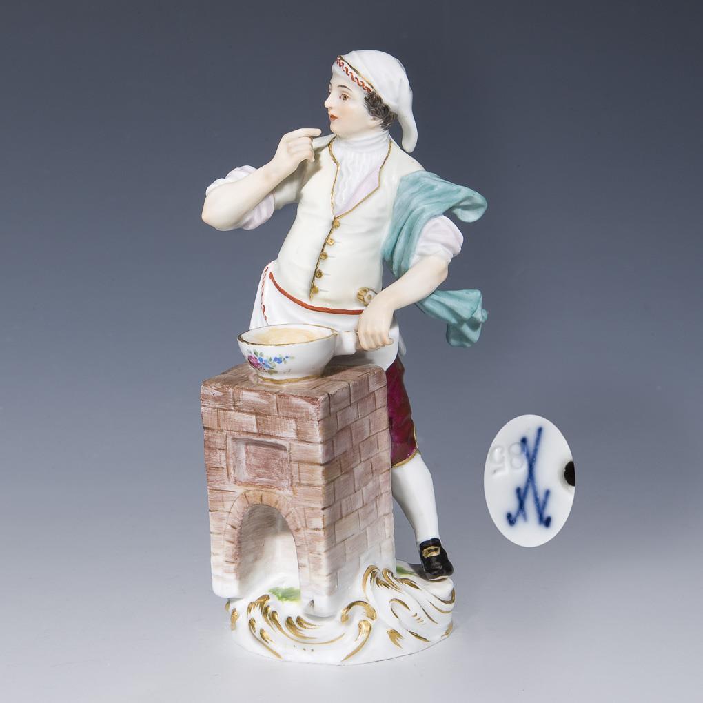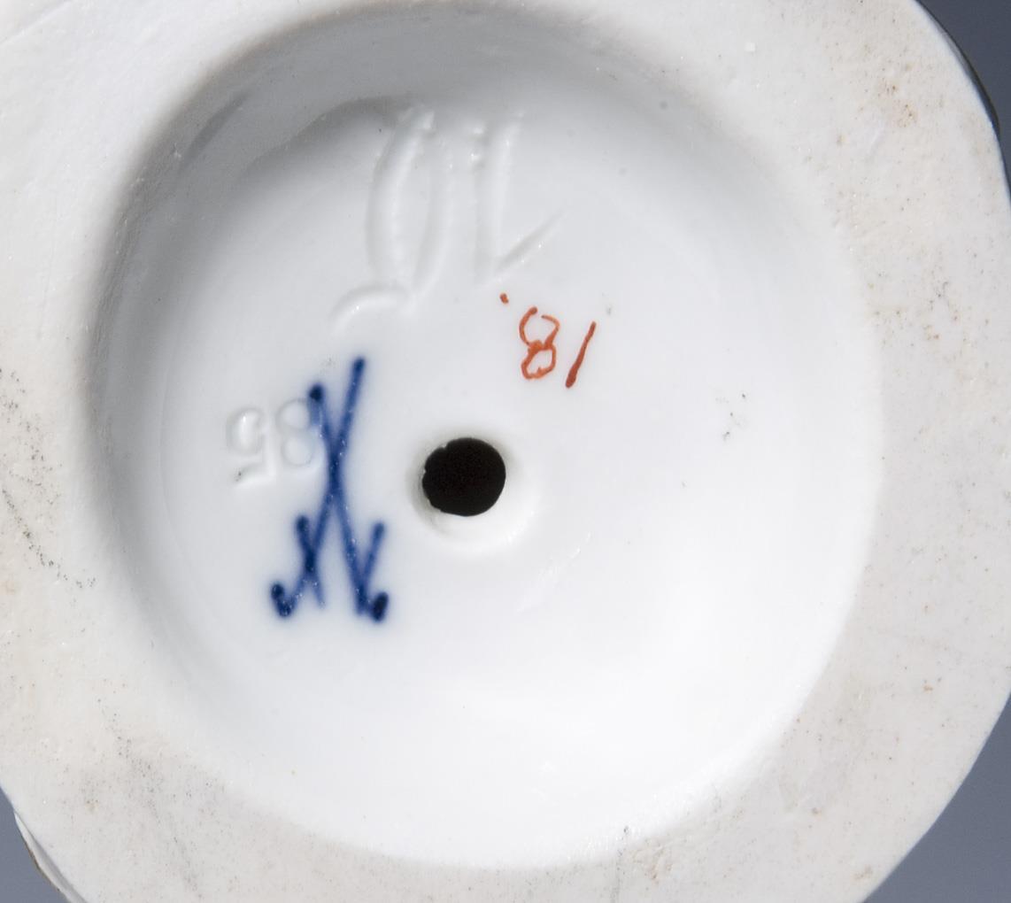 Modell von Peter Reinicke 1753-1754. Aus einer Serie von 34 Figuren. Farbig bemalt, gold staffiert. Ritzmarke, Pressmarke, Malermarke, Schwertermarke.