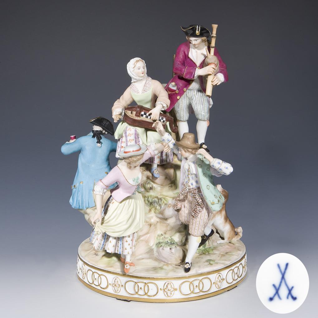 Modell von Michel Victor Acier 1772. Farbig bemalt, gold staffiert. Ritzmarke, Pressmarke, Malermarke, Schwertermarke. Baum fehlt, eine Figur an den Felsen geklebt, ein Schuh bestoßen, vier Arme, zwei Beine restauriert.