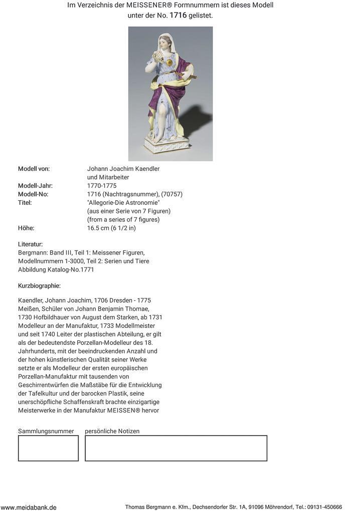 Modell von Johann Joachim Kaendler und Mitarbeiter 1770-1775. Aus einer Serie von 7 Figuren. Farbig bemalt, gold staffiert. Unglasierter Boden, Pressmarke, Schwertermarke, Ritzmarke am Sockel. Hände, Stab, ein Tuchzipfel restauriert.