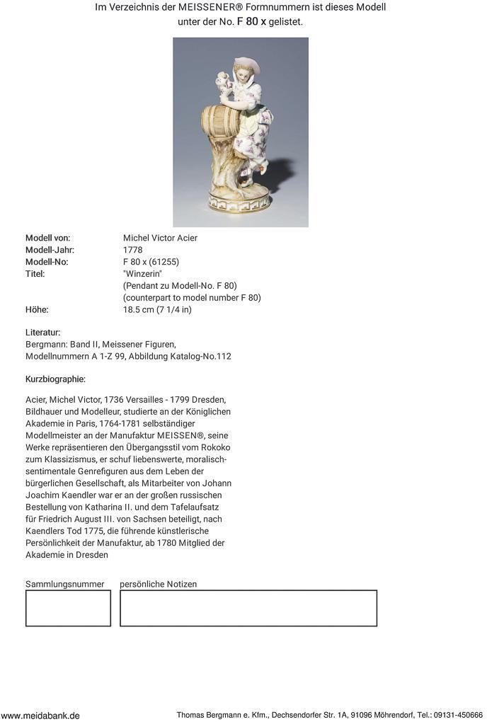 Acier, Bildhauer und Modelleur. Studierte an der Akademie in Paris. 1764-1781 selbständiger Modellmeister in Meissen. Meissen-Manufaktur-Preis: 4190,- Euro * Partnerauktion Bergmann.