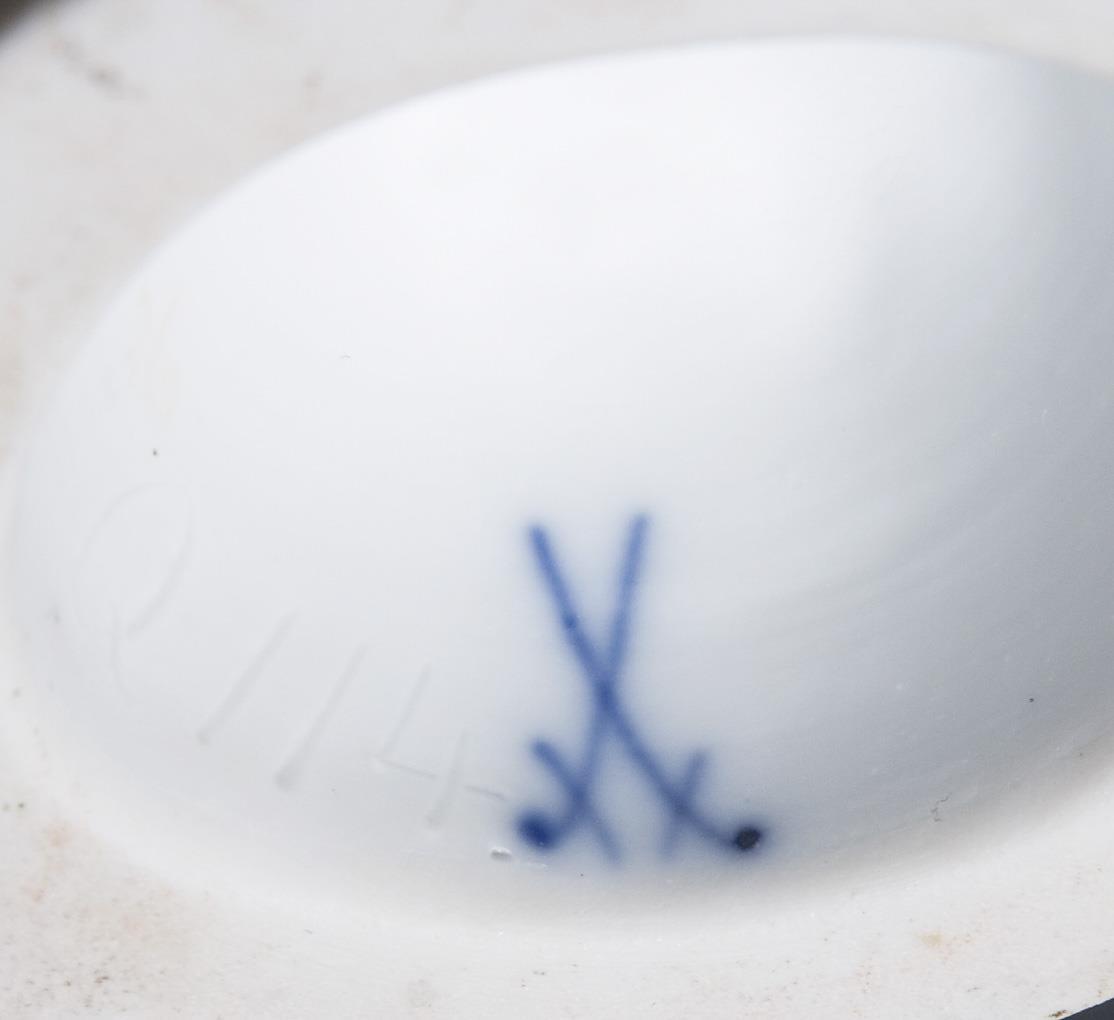 Modell von Alfred König 1895-1896. Pendant zu Modell-Nr. Q 115. Farbig bemalt, gold staffiert. Ritzmarke, Pressmarke, Schwertermarke. Kleid partiell, ein Arm, ein Unterarm, Kopf, Décolleté, einige Blätter restauriert.