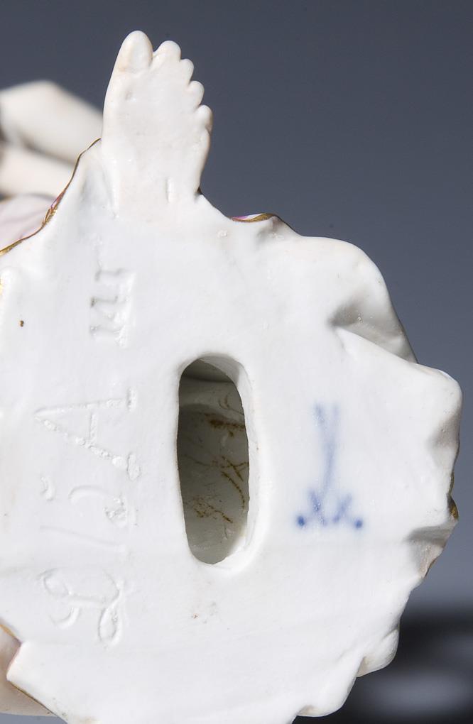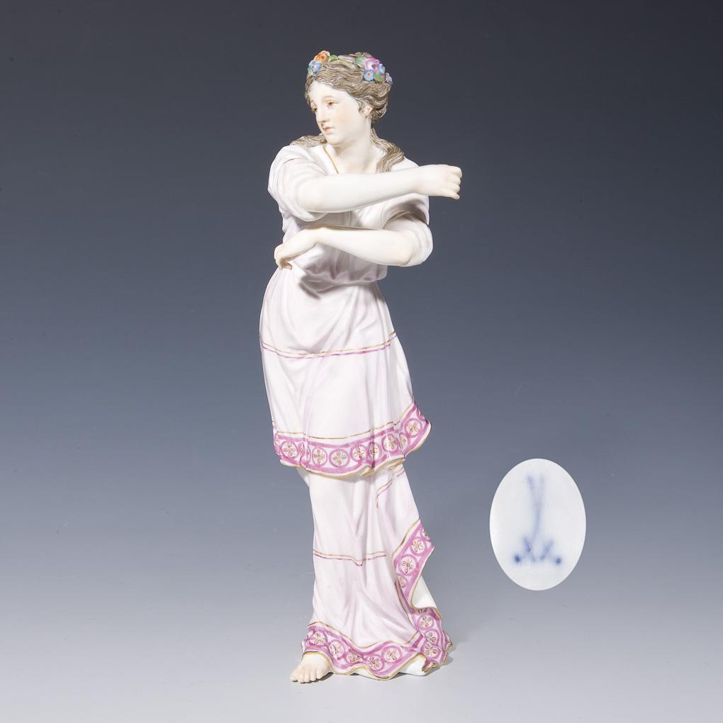 Modell von Carl Gotthelf Starcke der Jüngere 1797. Einzelfigur aus dem Tafelaufsatz. Farbig bemalt, gold staffiert. Unglasierter Boden, Ritzmarke, Pressmarke, Schwertermarke. Ein Fuß, Arme restauriert.