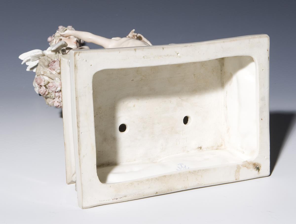 Modell von Johannes Benk (1844-1914). Farbig bemalt, ehemals gold staffiert. Ritzmarke, Pressmarke, Bodenmarke. Eine Taube, eine Hand restauriert, Pfeile und Flügel sichtbar alt restauriert.