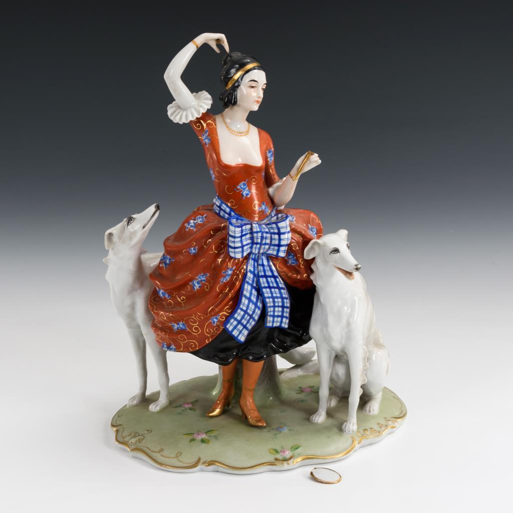 Rokokodame mit zwei Windhunden, einen Spiegel haltend. Spiegel abgebrochen (lose anbei), 1 Finger bestoßen.