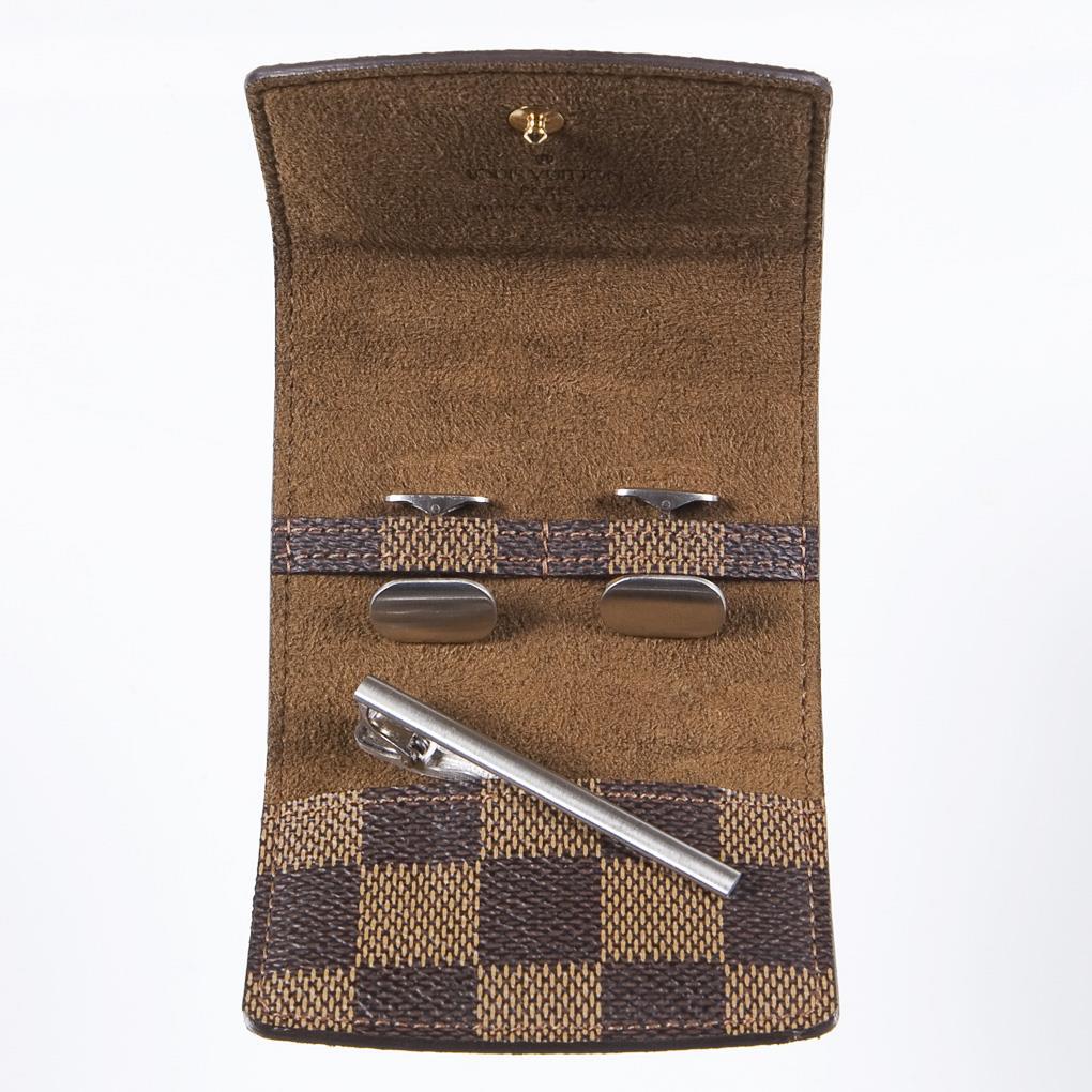 Paar Platin-Manschettenknöpfe, Platin-Krawattennadel im Louis Vuitton-Etui.