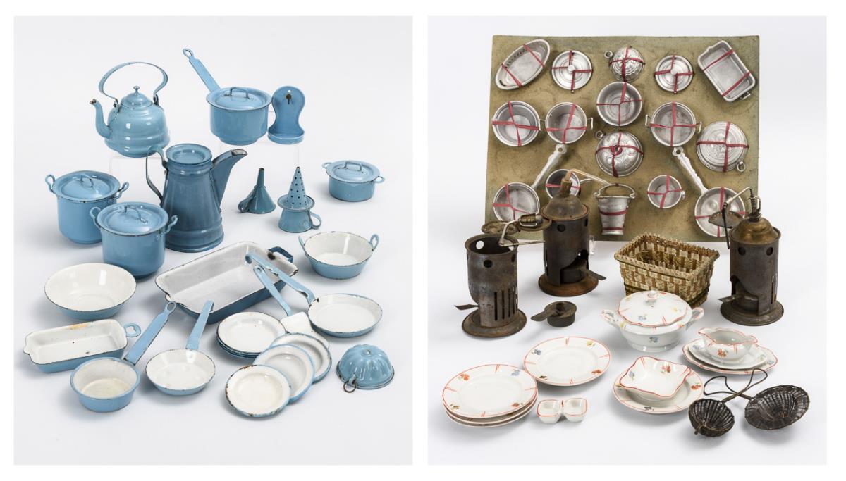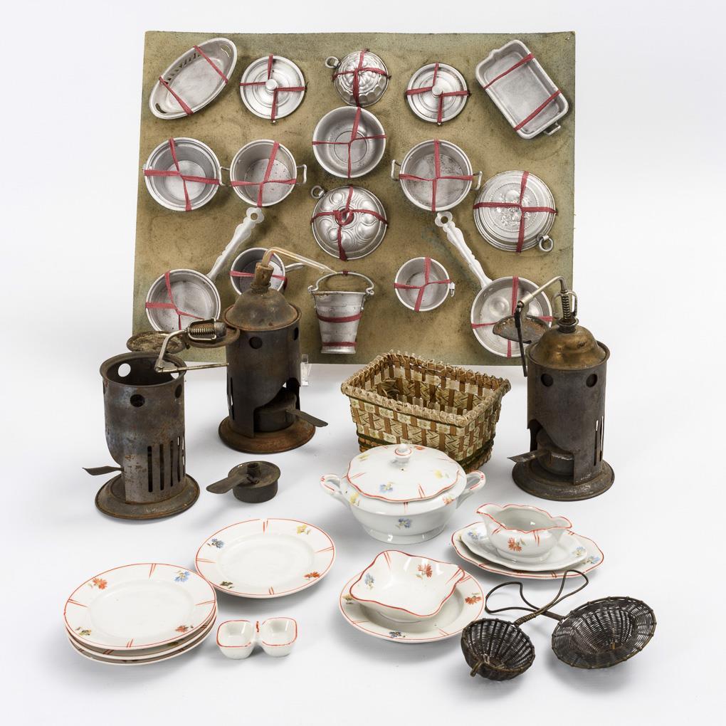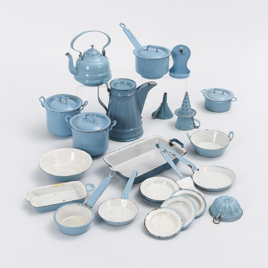26 Teile blau-weißes Emaillegeschirr. / Pappe mit 16 Teilen original geheftetem Metallgeschirr. / 10 Teile Porzellangeschirr Art déco. / 3 Brenner aus Blech.