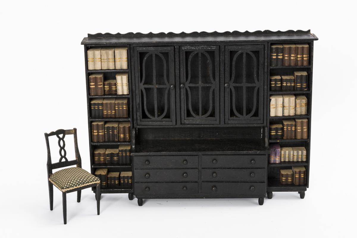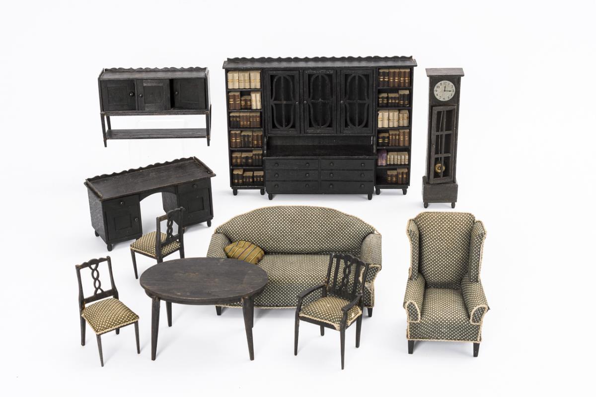 Großer Bücherschrank, Sideboard, Schreibtisch, Standuhr, Sofa, ovaler Tisch, 3 Stühle und Ohrensessel. Altersspuren, kleine Defekte und Klebestellen.