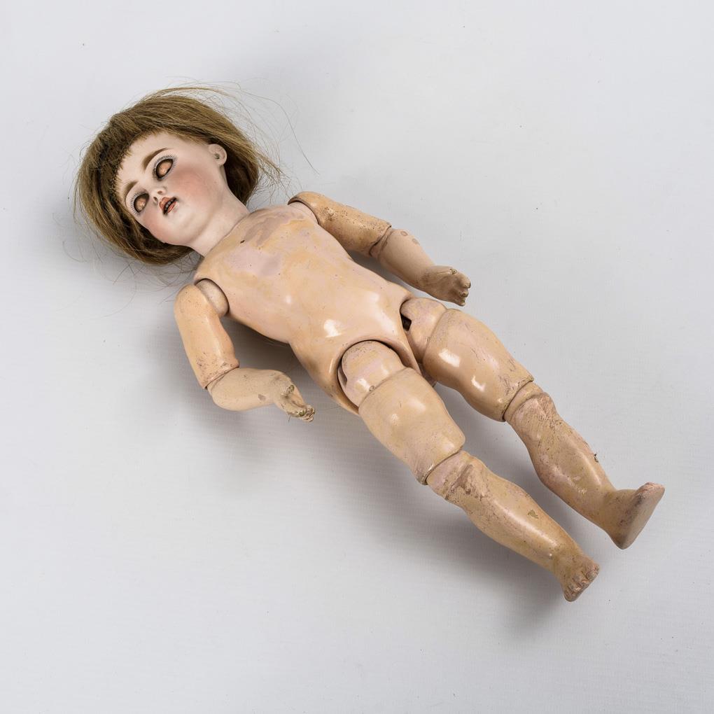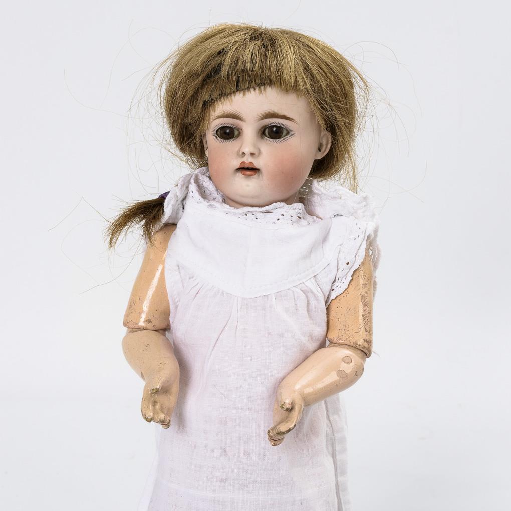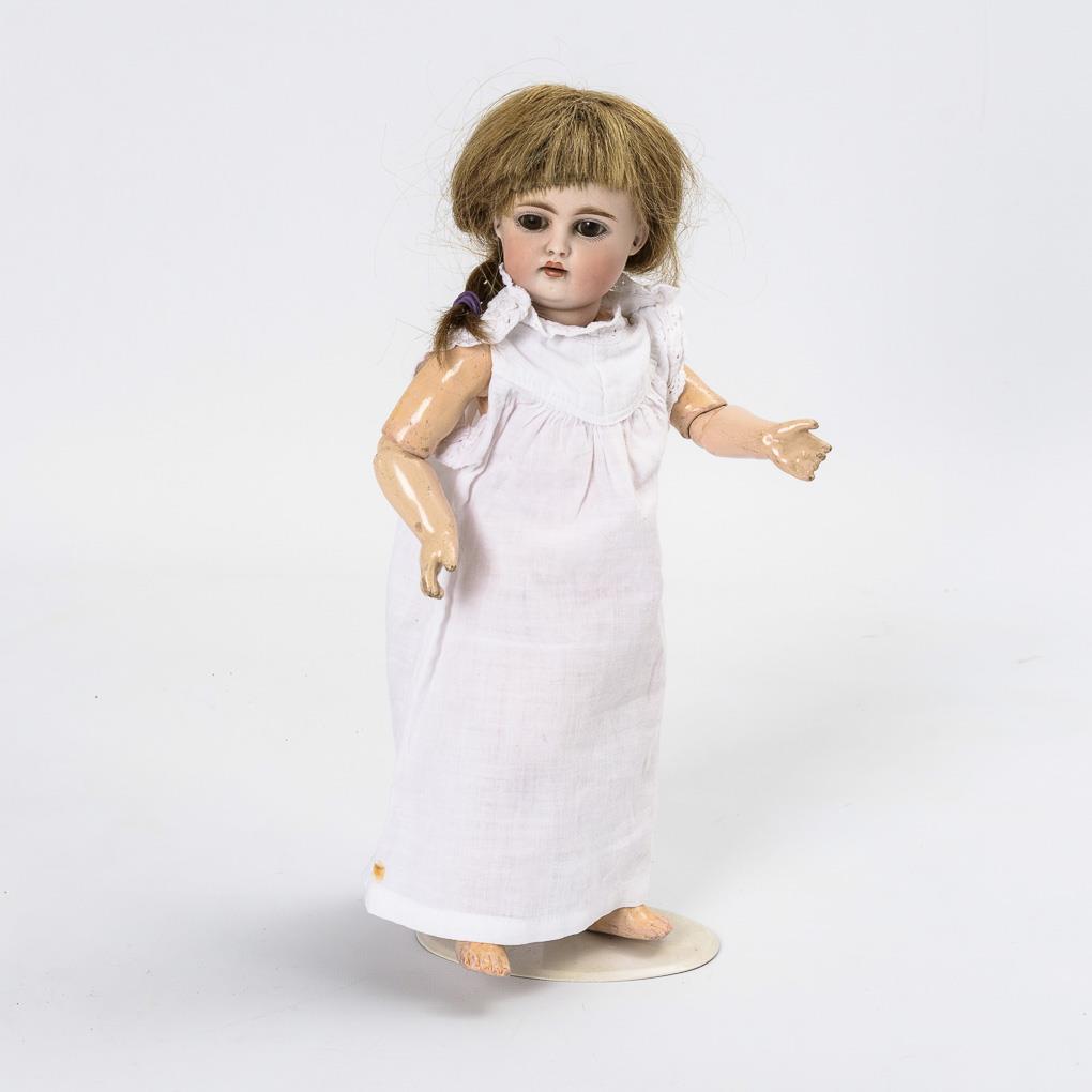 Kurbelkopf, braune Schlafaugen, Ohrlöcher, mittelblonde Echthaarperücke mit Zopf. 11-teiliger Gliederkörper, weißes Nachthemd. Kopf nicht durchleuchtet, jedoch keine Defekte sichtbar. Körper mit kleinen Farbdefekten.