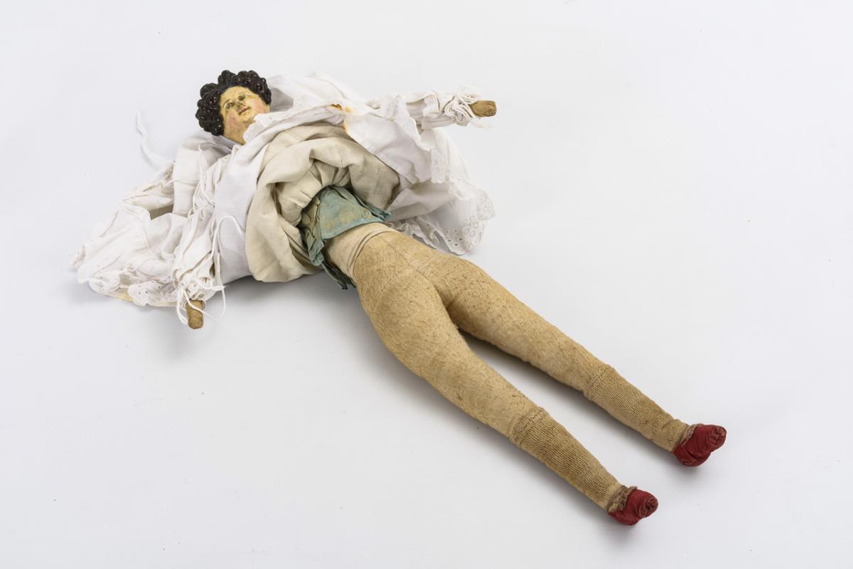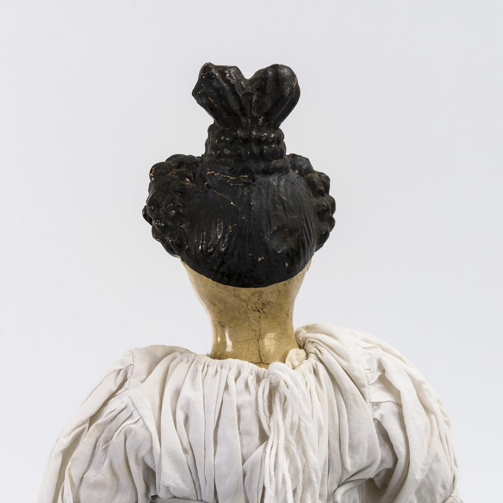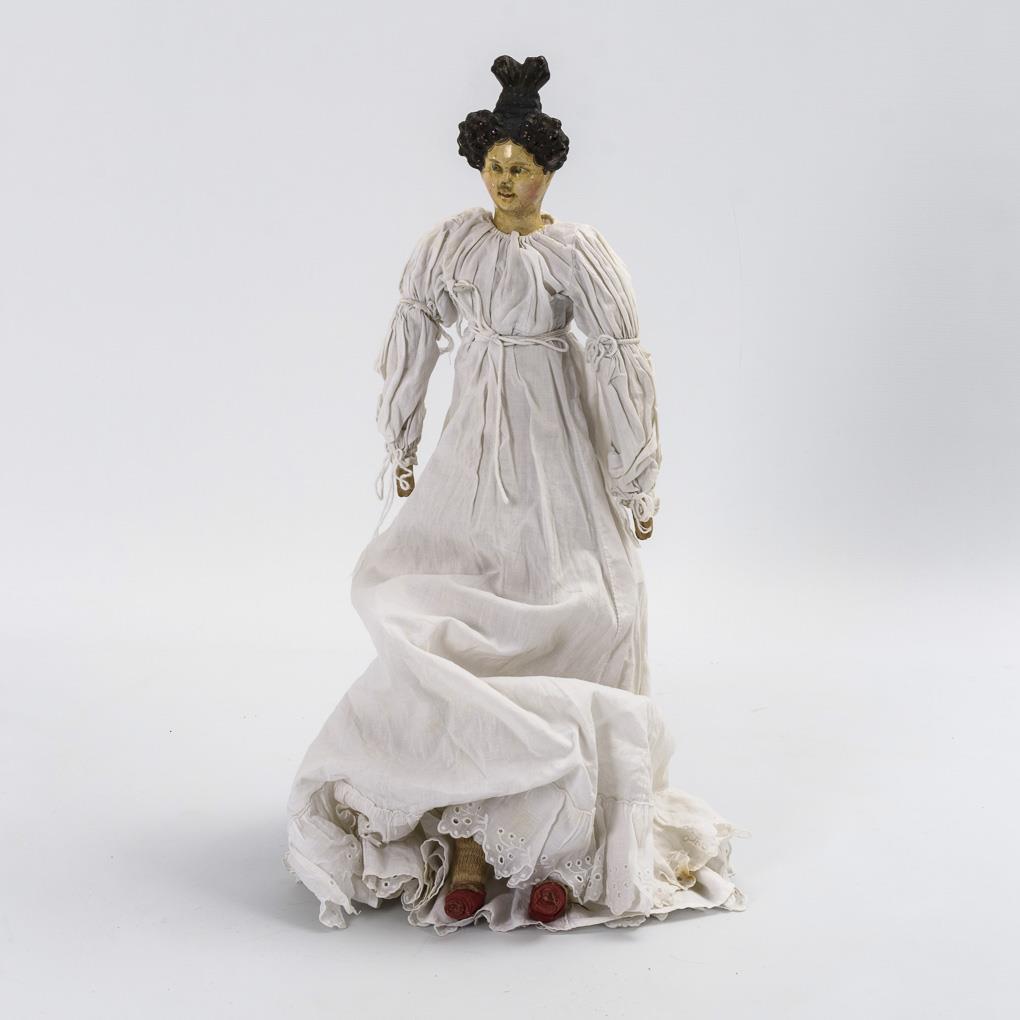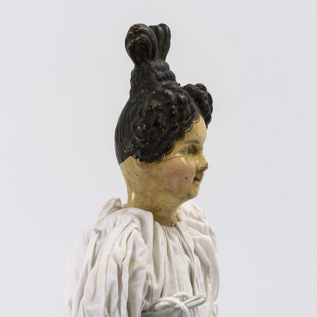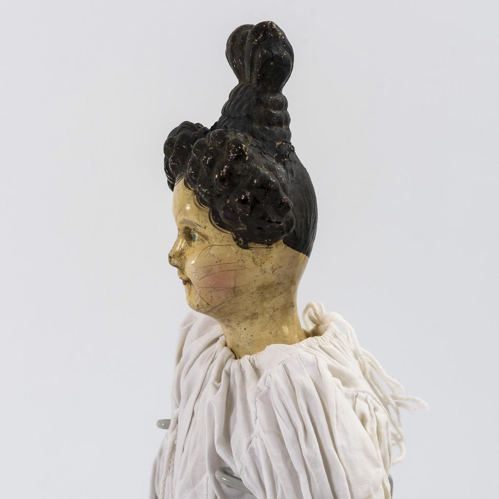 Brustkopf aus Papiermaché mit gemalten blauen Augen und außergewöhnlichem, herzförmigem Haarknoten. Stoffkörper mit Schlenkerarmen. Weißes Kleid, gestrickte Strümpfe, rote Stoffschuhe. Altersspuren, Kopf krakelliert, Frisur geklebt und retuschiert.