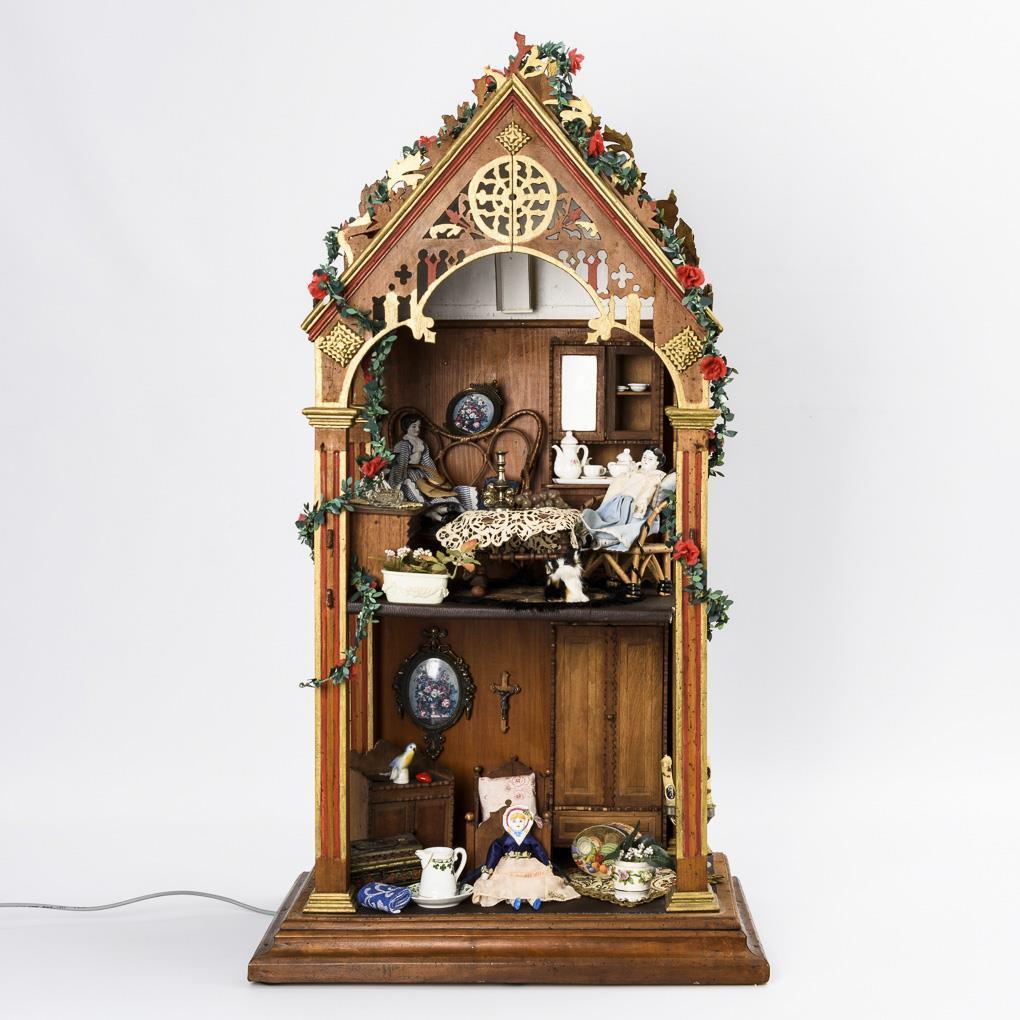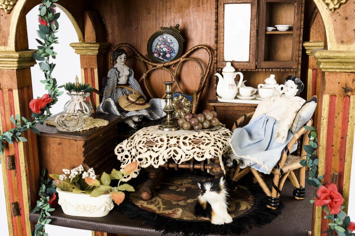 Dekoratives Gehäuse aus alten Teilen, mit durchbrochen gearbeitetem Ziergiebel und Frontsäulen. Wohn- und Schlafraum auf 2 Etagen, eingerichtet mit selbstgebauten Möbeln aus Zigarrenkisten, 3 Püppchen und teils jüngerem Zubehör. Verkabelt, Funktion nicht geprüft. Bespielt, Altersspuren.