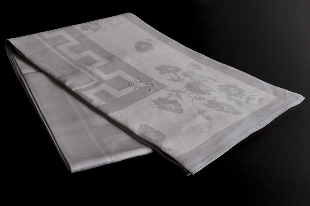 Sehr großes Tuch mit umlaufender Borte aus Stiefmütterchen, in den Ecken als große Sträuße. Nach innen folgend, breites Mäanderband sowie Mohnsträuße und Kleeblätter mit Blüten, über das gesamte Tuch gleichmäßig verteilt. Weiß gesticktes Monogramm "LF" unter Freiherrenkrone. Ungebraucht/einmal gewaschen.