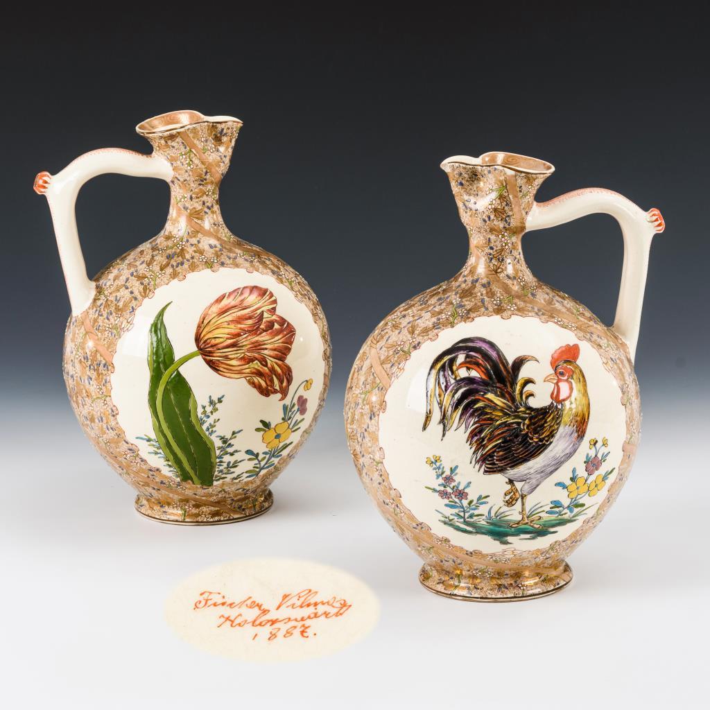 Paar Gründerzeit-Henkelkrüge mit Hahnenmotiv