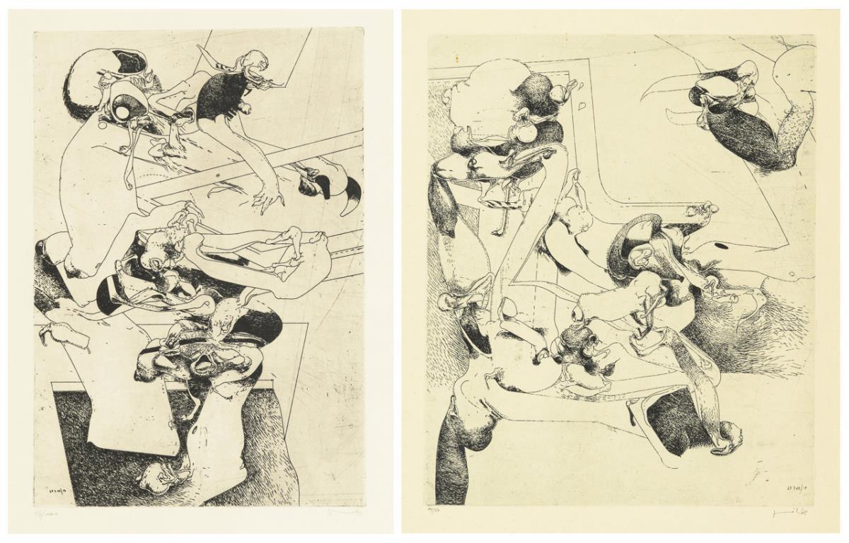 Ohne Titel, Exemplar: 14/50, in der Platte datiert: "23.3.68", Druckplatte: 30,8 x 25,5 cm, gerahmt & hinter Glas: 60 x 50 cm, Abbildungsbereich etwas lichtgebräunt | Ohne Titel, Exemplar: 16/100, in der Platte datiert: "24.3.68", Druckplatte: 33,6 x 23,5 cm, Blatt: 54 x 38 cm, gerahmt & hinter Glas: 65 x 50 cm, Blattrand etwas lichtgebräunt und griffspurig.