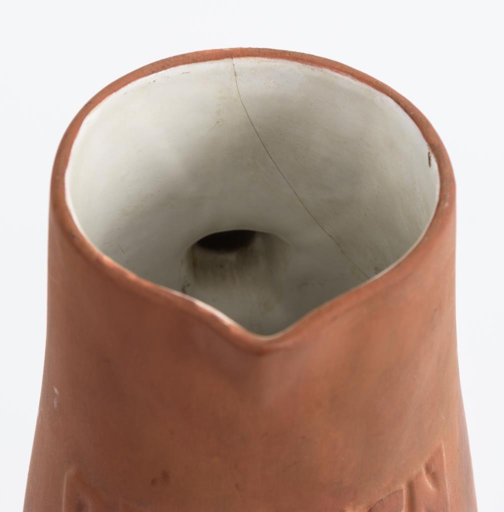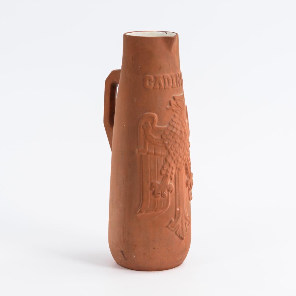 Konischer Krug mit kleiner Schneppe und gewinkeltem Henkel. Schauseitig ein Adler-Relief, bezeichnet "Cadinen". Außen retuschierter Wandungsriss, leichte Gebrauchsspuren.