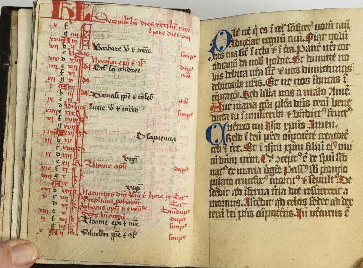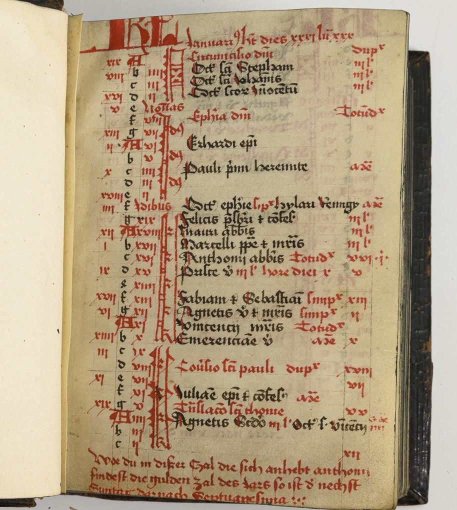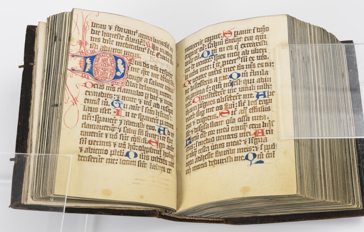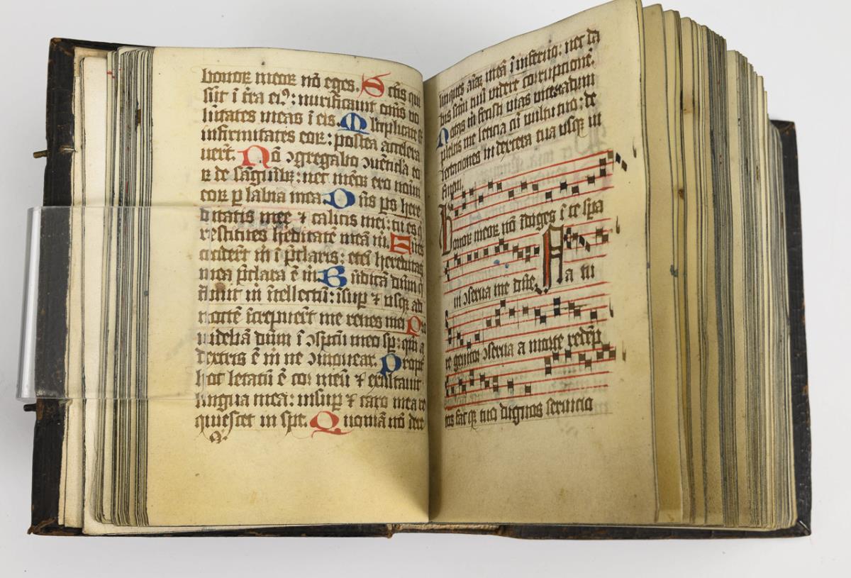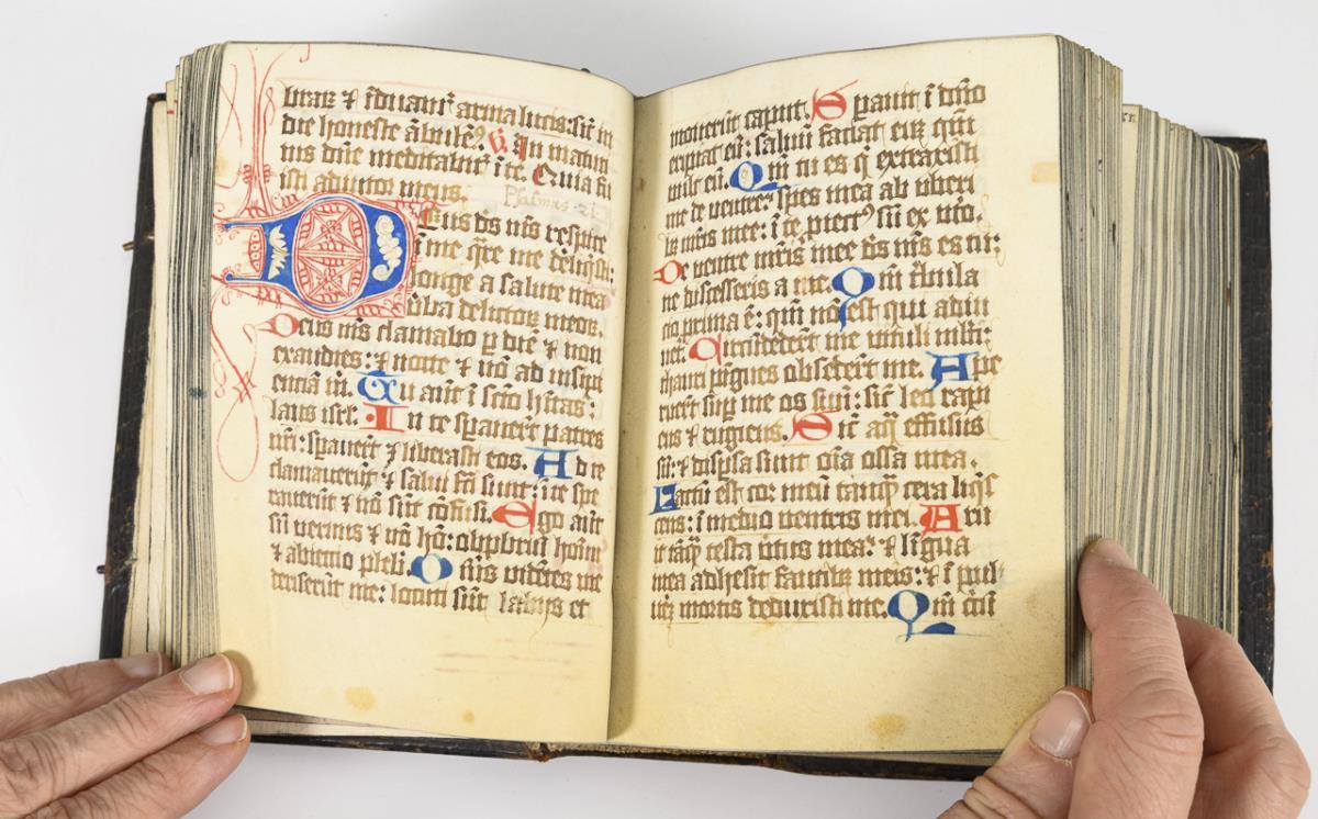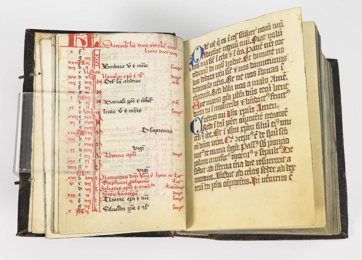 Lateinische Handschrift (Textura quadrata) auf Pergament, in Braun, Blau und Rot. Jahreskalendarium und religiöser Text beginnend mit dem "Vater Unser" und dem "Ave Maria". Text im Kalendarium mit deutschsprachigen Nachträgen. Kalendarium und Text wohl von verschiedenen Händen geschrieben. (Text wohl von einer Nonne verfasst. Siehe letzte Zeile: "Pit Got fur die Schreiberin… "), eventuell später zusammengeführt. Ausstattung: einfache Lombarden, Quadratnotation, Fleuronée-Initialen im Psalterium (solide Qualität). Auf den letzten zwei Seiten Nachträge von dritter Hand. Ursprünglich vorhandene Blattweiser, durch Beschneidung entfernt. Buchblock selbst zumindest im oberen Bereich beschnitten und im 17. Jh. neu in Leder gebunden, Schließen fehlen.