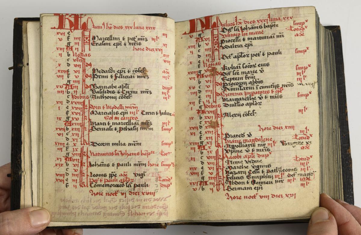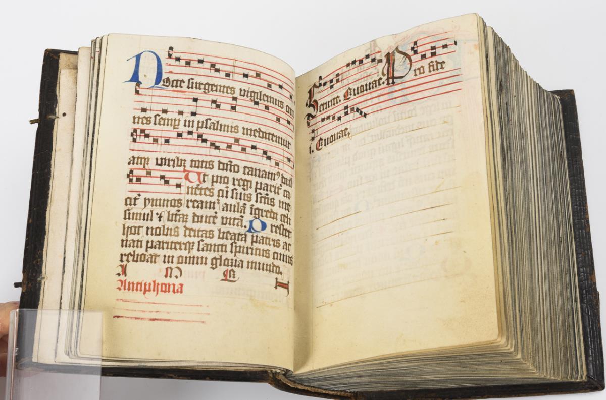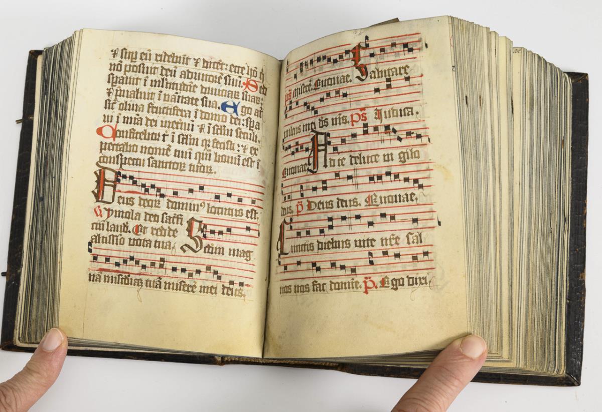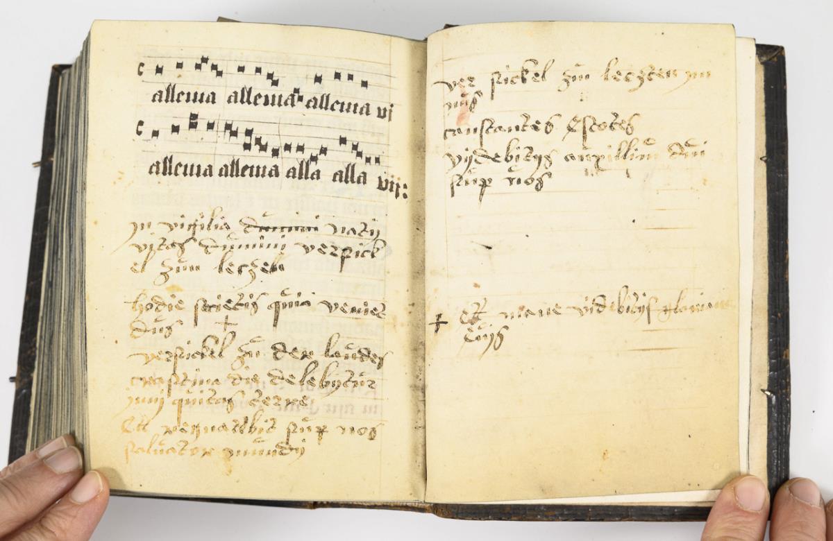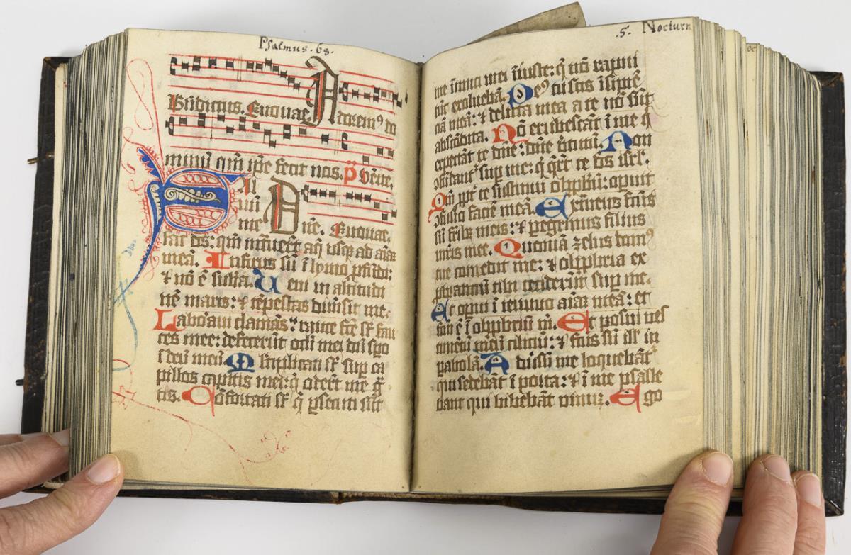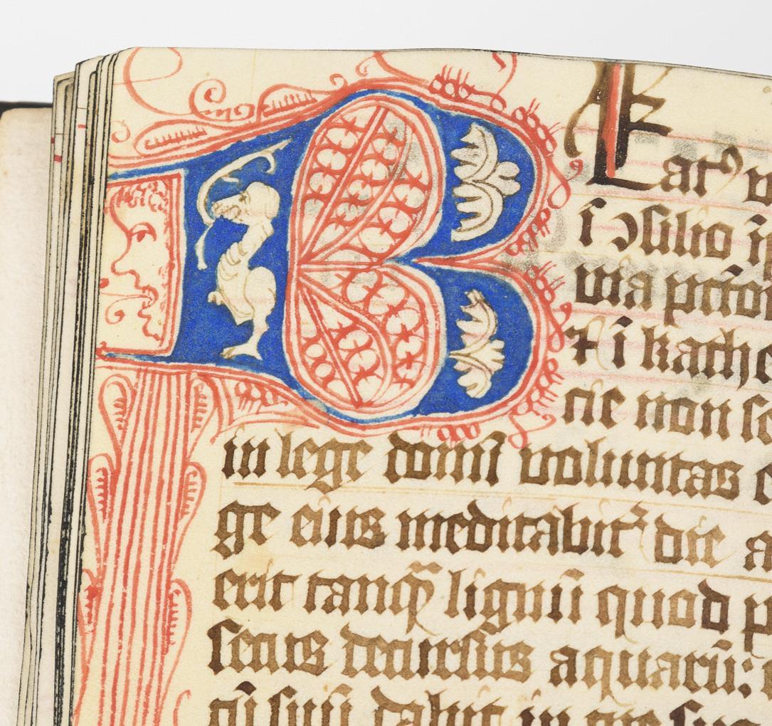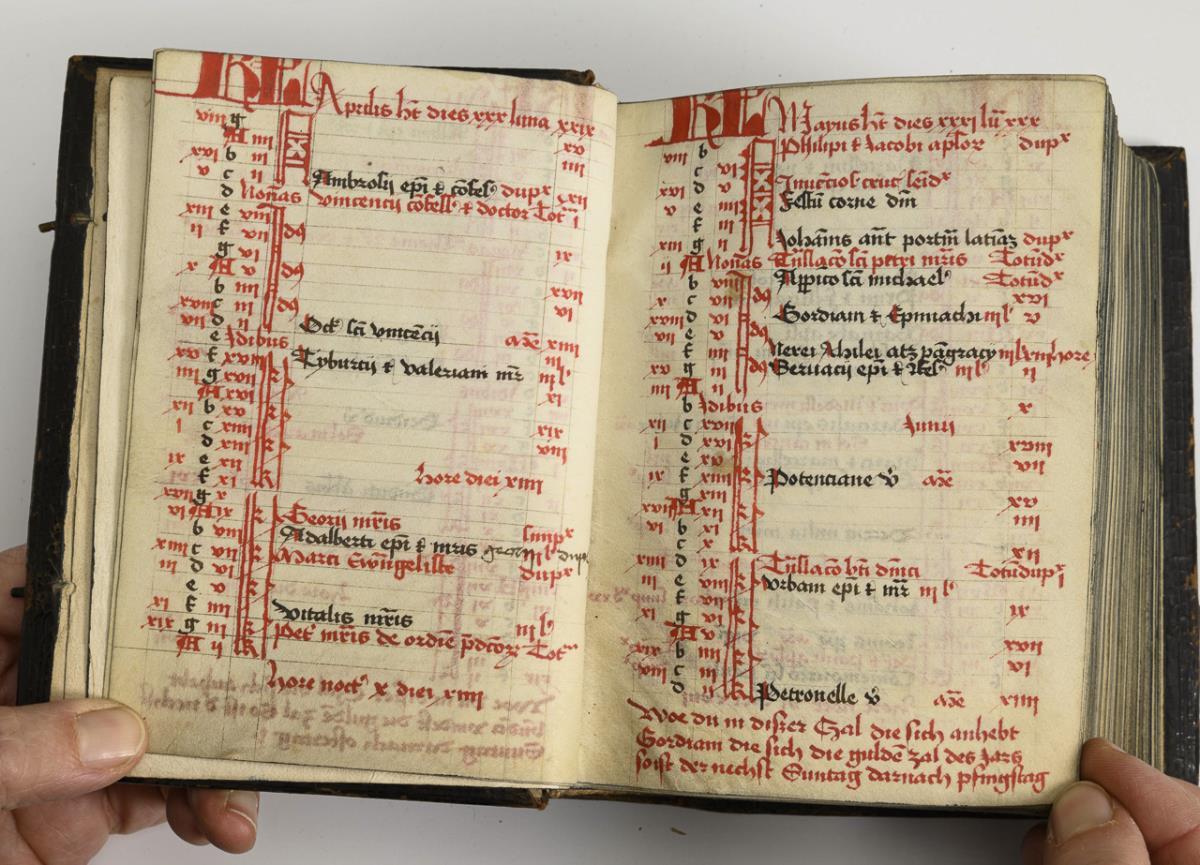Lateinische Handschrift (Textura quadrata) auf Pergament, in Braun, Blau und Rot. Jahreskalendarium und religiöser Text beginnend mit dem "Vater Unser" und dem "Ave Maria". Text im Kalendarium mit deutschsprachigen Nachträgen. Kalendarium und Text wohl von verschiedenen Händen geschrieben. (Text wohl von einer Nonne verfasst. Siehe letzte Zeile: "Pit Got fur die Schreiberin… "), eventuell später zusammengeführt. Ausstattung: einfache Lombarden, Quadratnotation, Fleuronée-Initialen im Psalterium (solide Qualität). Auf den letzten zwei Seiten Nachträge von dritter Hand. Ursprünglich vorhandene Blattweiser, durch Beschneidung entfernt. Buchblock selbst zumindest im oberen Bereich beschnitten und im 17. Jh. neu in Leder gebunden, Schließen fehlen.
