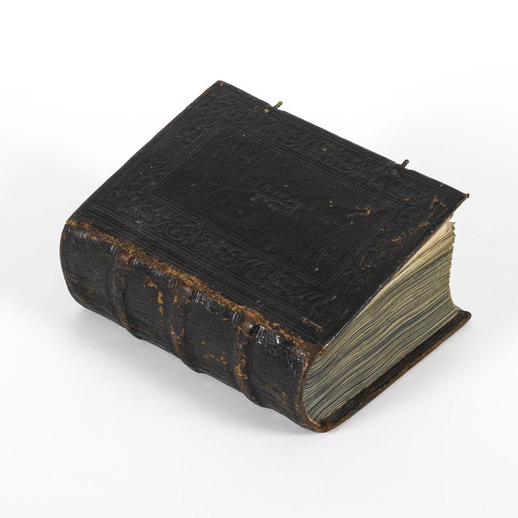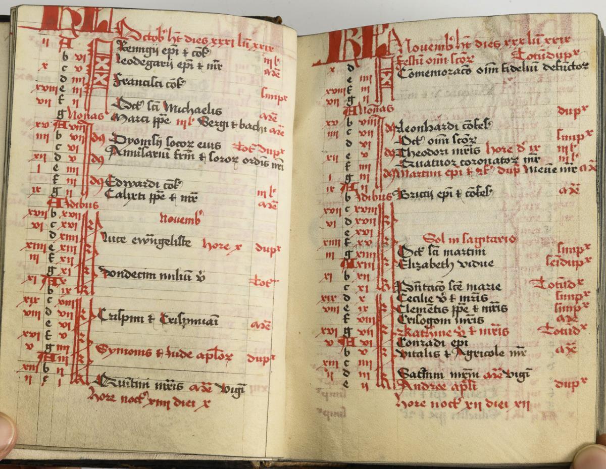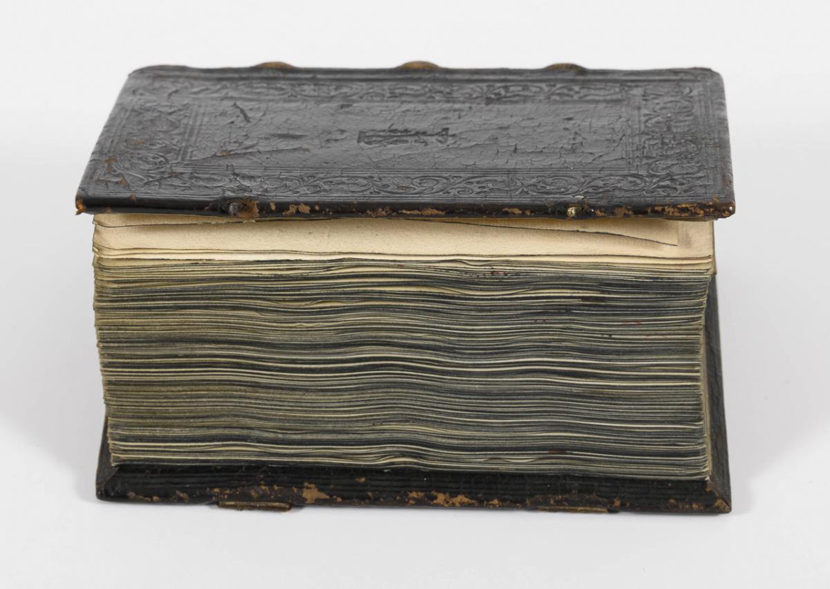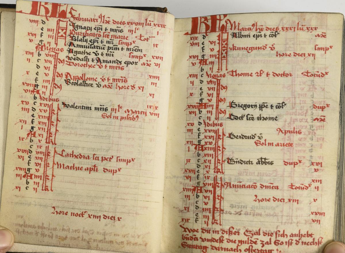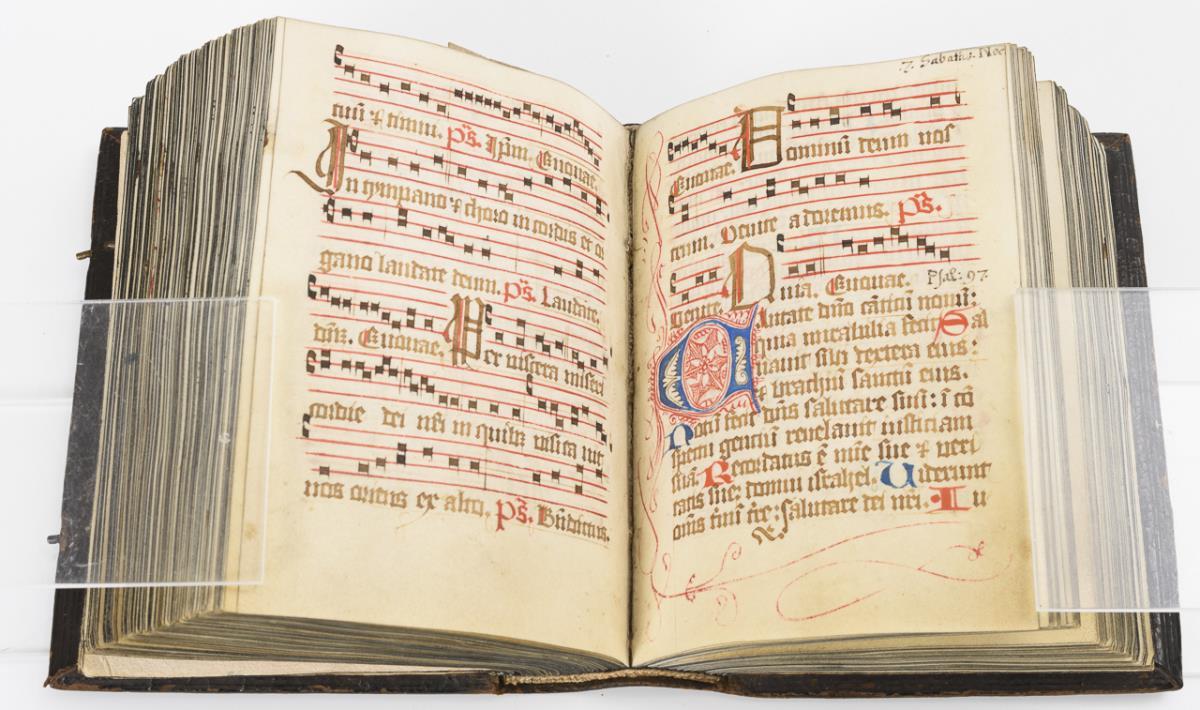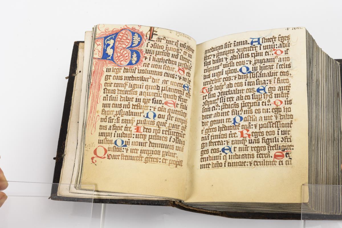 Lateinische Handschrift (Textura quadrata) auf Pergament, in Braun, Blau und Rot. Jahreskalendarium und religiöser Text beginnend mit dem "Vater Unser" und dem "Ave Maria". Text im Kalendarium mit deutschsprachigen Nachträgen. Kalendarium und Text wohl von verschiedenen Händen geschrieben. (Text wohl von einer Nonne verfasst. Siehe letzte Zeile: "Pit Got fur die Schreiberin… "), eventuell später zusammengeführt. Ausstattung: einfache Lombarden, Quadratnotation, Fleuronée-Initialen im Psalterium (solide Qualität). Auf den letzten zwei Seiten Nachträge von dritter Hand. Ursprünglich vorhandene Blattweiser, durch Beschneidung entfernt. Buchblock selbst zumindest im oberen Bereich beschnitten und im 17. Jh. neu in Leder gebunden, Schließen fehlen.