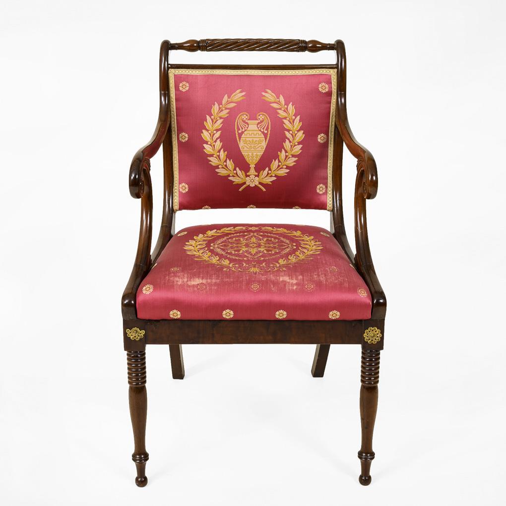 Gepolsterter Lehnstuhl mit volutierten Armlehnen und gedrechselter Schulterlehne, auf konischen Drechselbeinen, roter, an der vorderen Kante etwas beriebener Bezug mit Amphora und Lorbeerkranz. Sonst gute Erhaltung mit wenigen Alters-/Gebrauchsspuren.