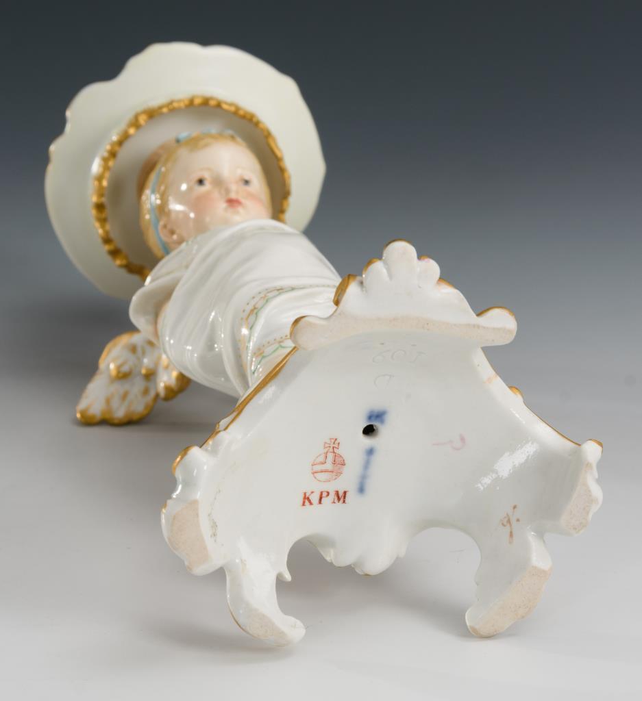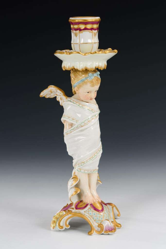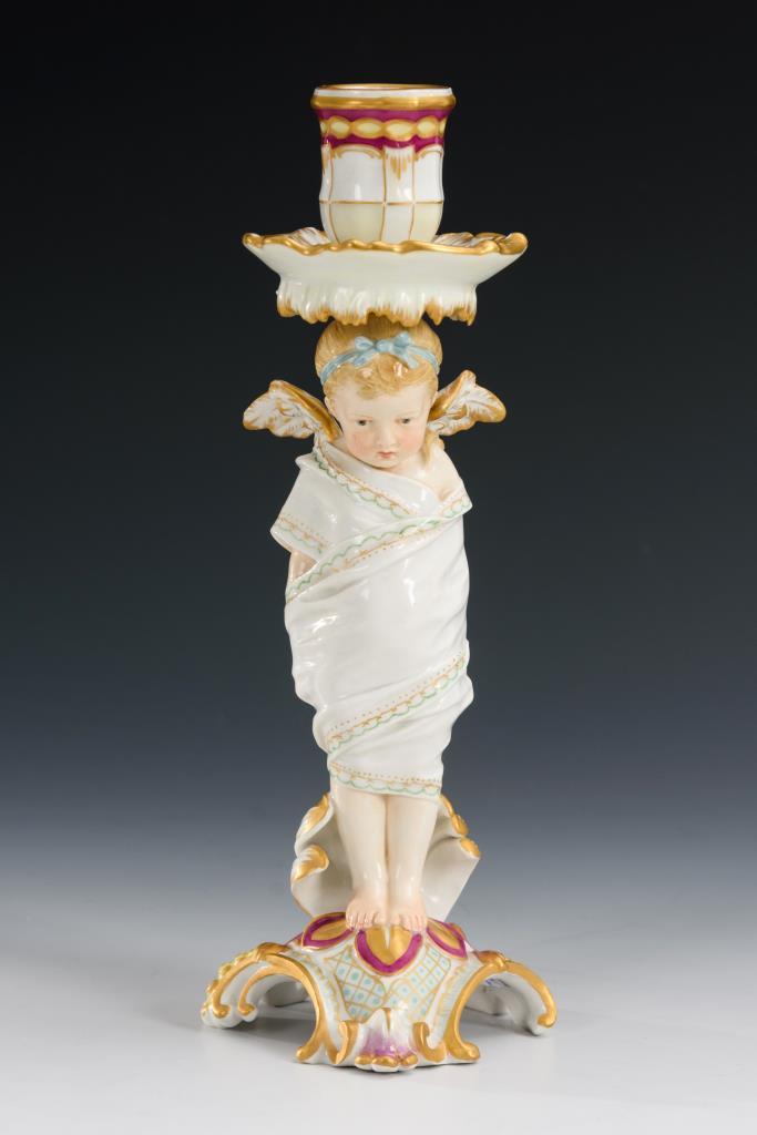 Auf einem Rocaillesockel stehendes, mit einem Tuch gefesseltes Puttenmädchen, auf dem Kopf die Kerzentülle tragend. Zopf geklebt, Hals restauriert.