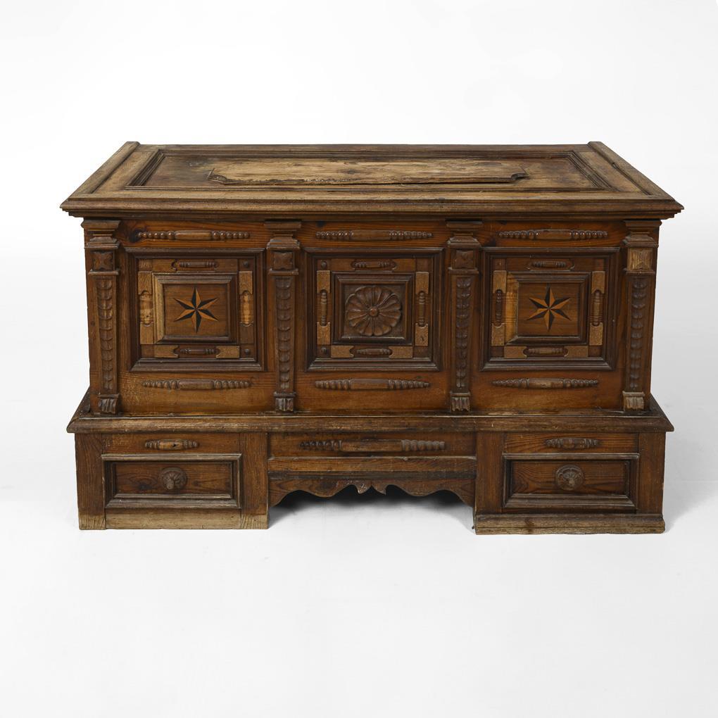 Kastentruhe in Brettbauweise mit architektonisch gegliederter, kassettierter Front mit Pilastern und Rosettenrelief, darin feine Sternintarsien, Sockel mit Blenderschüben; innen mit bunter Tapete ausgekleidet. Alters-/Gebrauchsspuren, alt restauriert, Zierornamente teils fehlend.